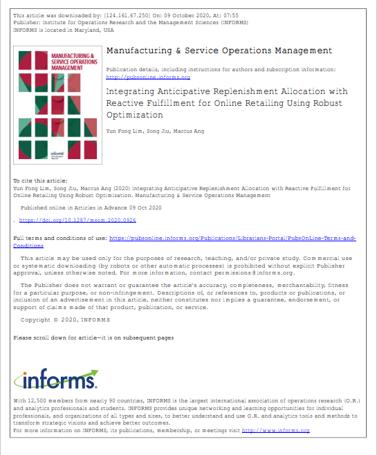 Assistant Professor Jiu Song of the School of Economics and Management of Southwest Jiaotong University published a paper entitled Integrating Anticipative Replenishment Allocation with Reactive Fulfillment for Online Retailing Using Robust Optimization in UTD 24 Journal - Manufacturing & Service Operations Management in October 2020. This paper studies the collaborative optimization of multi-p...