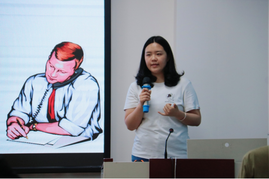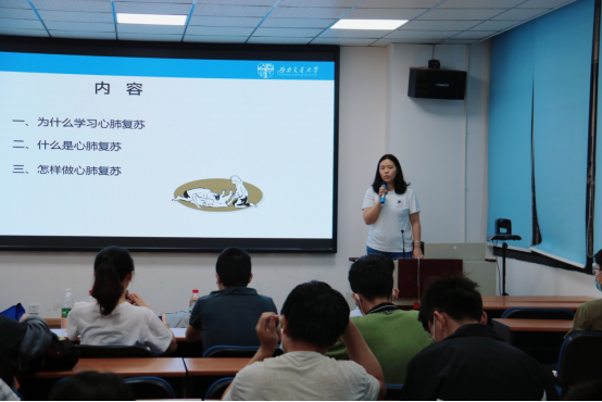 首先,医公司党员服务先锋队队长喻谦讲述了一些患者因心脏骤停或者呼吸骤停却得不到及时有效的救助而不幸离世的实例,突显学习急救知识、掌握急救技能的重要性。随后喻谦向同学们讲解了心肺复苏的概念及操作流程,整个操作流程大致分为以下八个步骤:评估环境、判断意识、高声呼救、摆放体位、判断呼吸、胸外心脏按压、打开气道、人工呼吸。她详细地向同学们解释了每一个步骤的注意事项,并重点指出了评估环境的关键性,强调了在救助他人的同时更要保护好自身的安全。