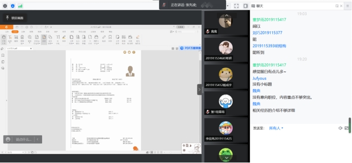 随后,辅导员张先凌针对一个具体简历进行案例分析。首先针对案例简历存在的一些问题,同学们进行了积极的讨论。张先凌针对同学们的反馈做出了具体的分析并提醒同学们简历留白较多可以采用一些规范的模板。张先凌还重点讲解了实习经历的撰写关键,并提出了“STAR法则”,即“情景、任务、行动、结果”。根据这一原则,匹配意向岗位的需求,去分解实习内容,并且有针对、有倾向地去撰写简历,这样也有利于企业HR了解大家的工作能力。当然,对于没有企业实习的同学来说,可以从学校的暑期实训、项目比赛和赛盘模拟中提炼内容,以此丰富我们的简历。