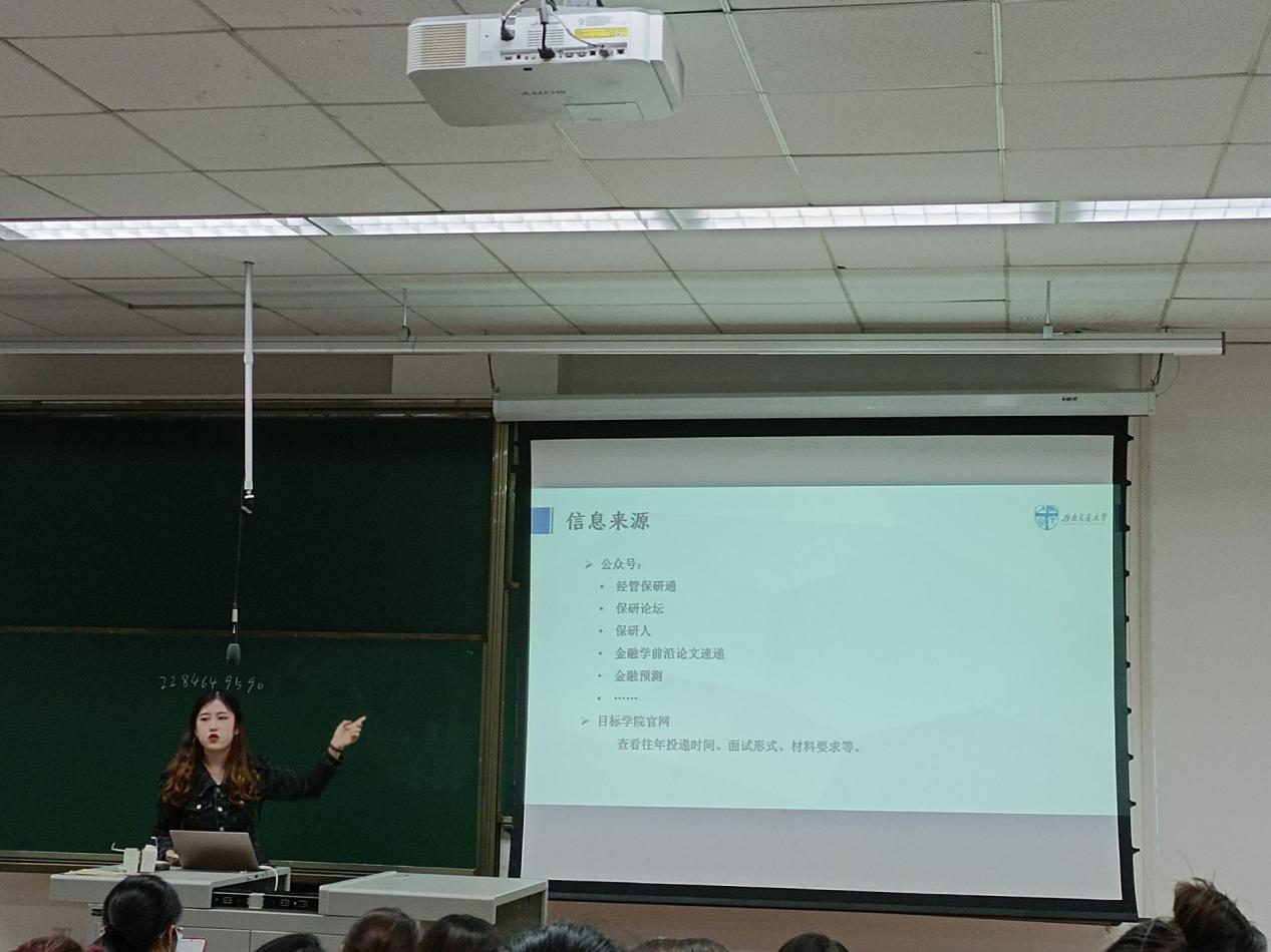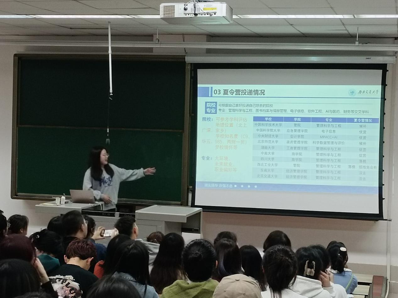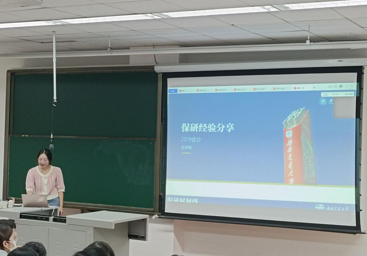 首先,金李畅学姐分享了她保研至上海财经大学的经验。学姐先带领同学们了解保研比例,并介绍综合加分的各种途径,然后着重介绍了夏令营的前期准备。学姐从自我定位、复习专业课、准备材料三方面展开叙述,从自身经历出发,切合实际地给出同学们一些建议。