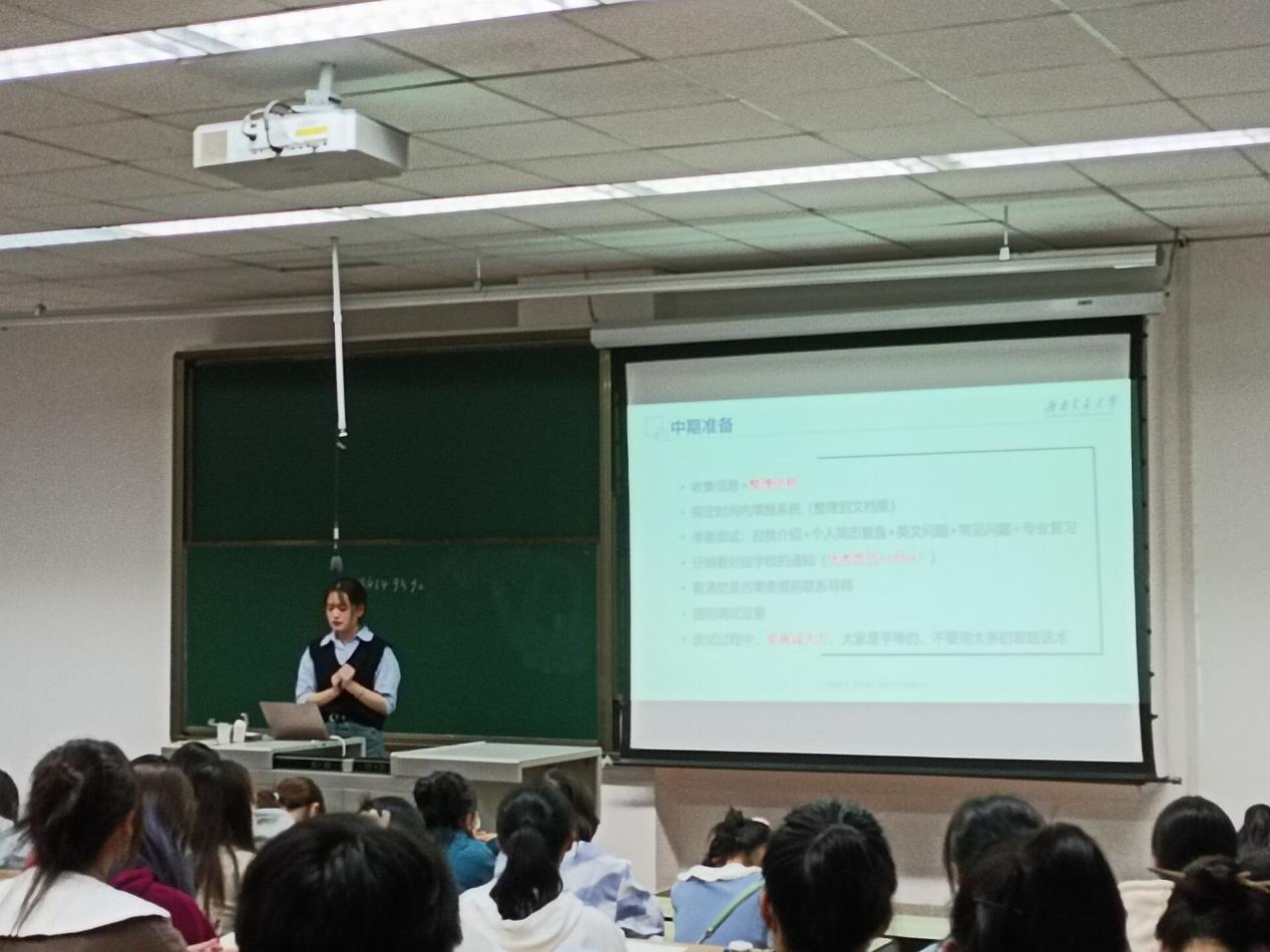 夏书敏学姐则和大家分享了她保研至南京大学的经验。学姐首先通过提出两个问题:“保研是什么?”、“什么时候开始准备?”,让同学们明确了保研前期的准备工作。同时,她向同学们提出了两点建议,一要自我评估,查漏补缺;二要信息收集,做好对保研基本概念与时间线以及院校信息等材料的收集。她还分享了自身的面试经验,让同学们了解了面试的具体过程。