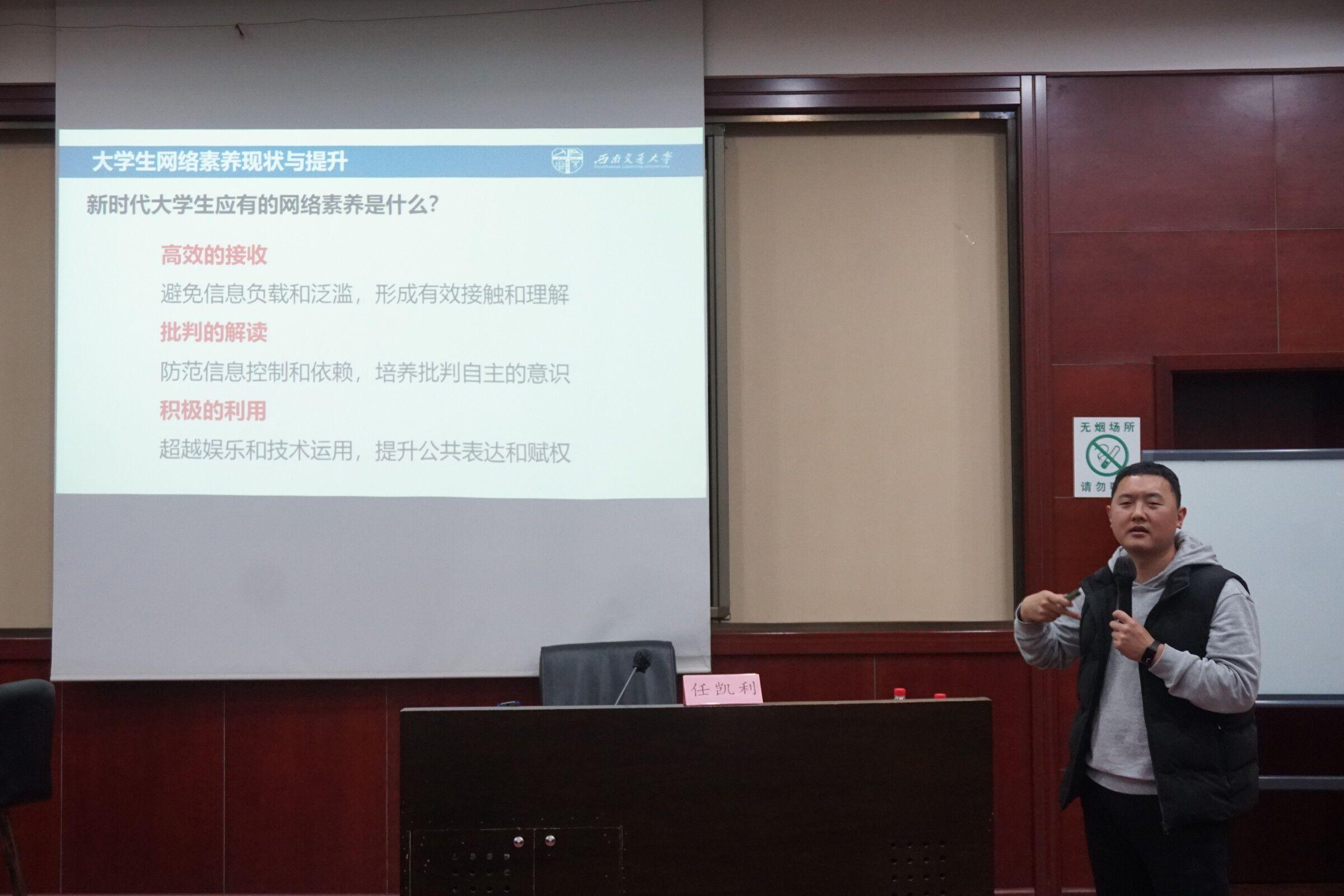 他提到“自投罗‘网’,方能网罗未来”,鼓励同学们接触并了解新媒体,主动提升自身网络素养,培养高效接收、批判解读和积极利用网络信息的能力。另外,他还指出当代老员工在网络素养方面缺乏的“十个力”,用举例和提问的方式引发同学们进行自我反思。