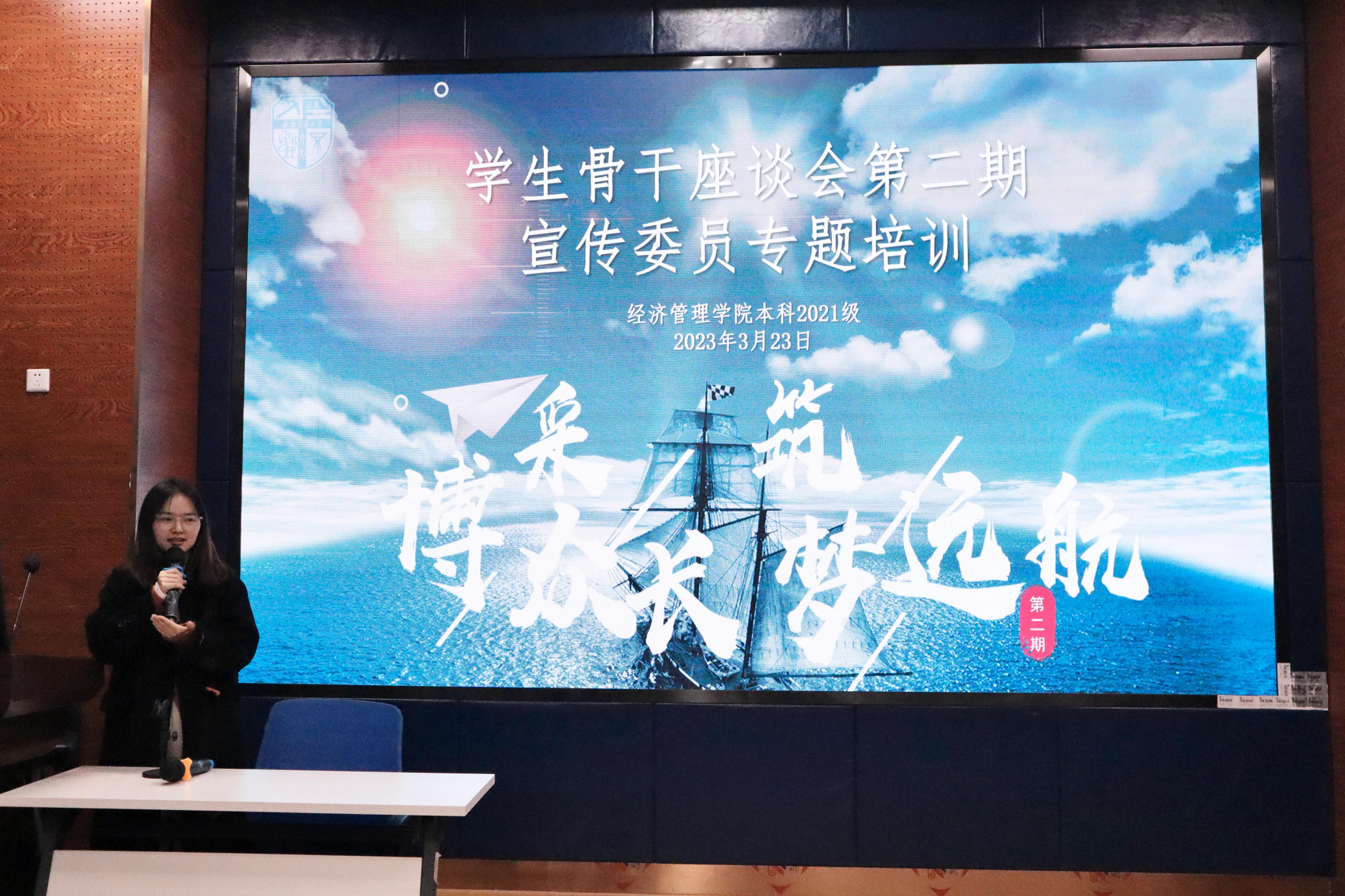 为进一步打造素质高、能力强的宣传队伍,培养员工干部业务能力,2023年3月23日19时30分,HAHA体育本科2021级于J0218教室开展“博采众长,筑梦远航”第2期员工骨干座谈会。本次座谈会邀请经英传媒中心新闻采编部部长李吴傲、摄影部副部长陈焕主讲,本科2021级辅导员张先凌、莫代玉出席,各班宣传委员及部分其他员工干部参加。