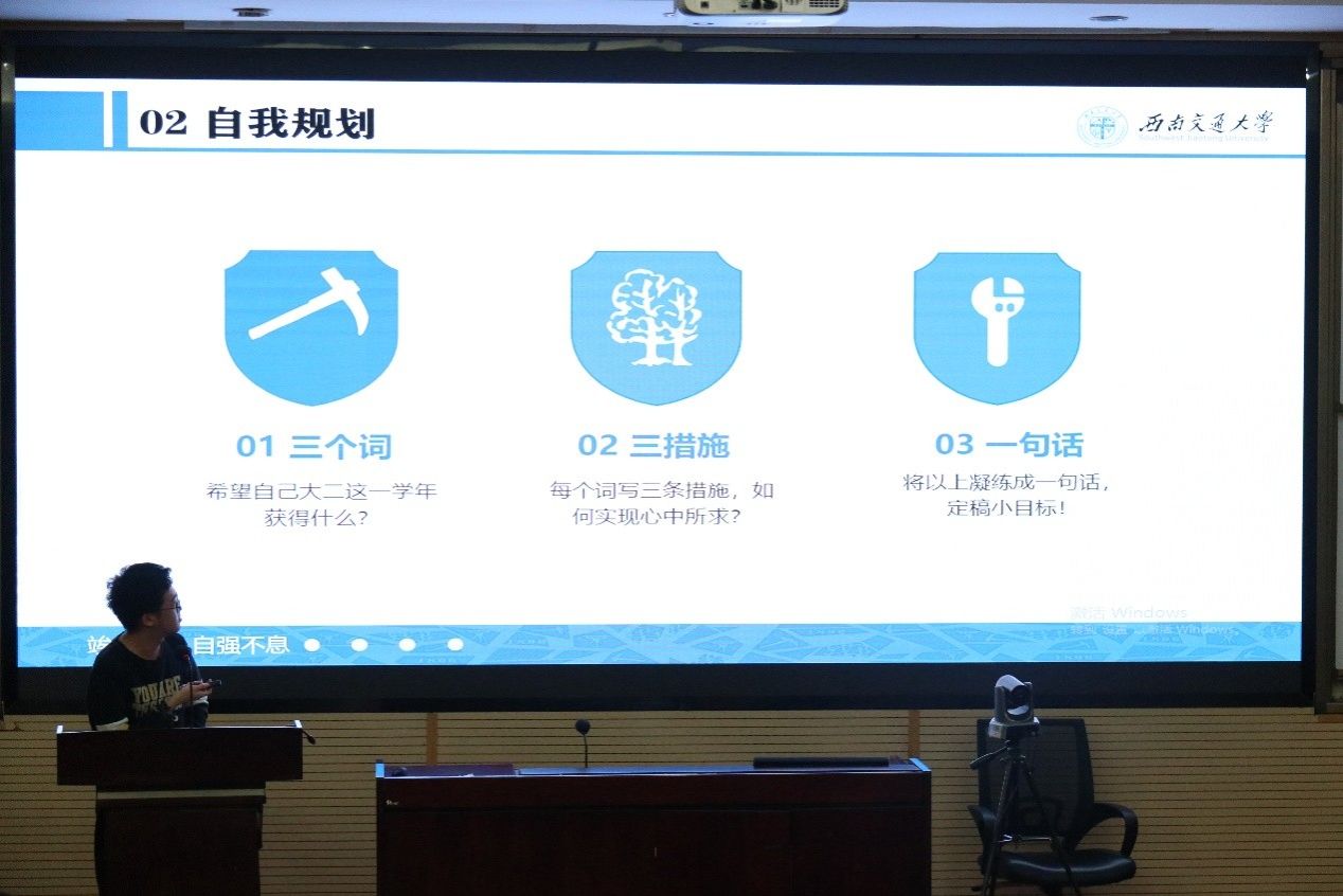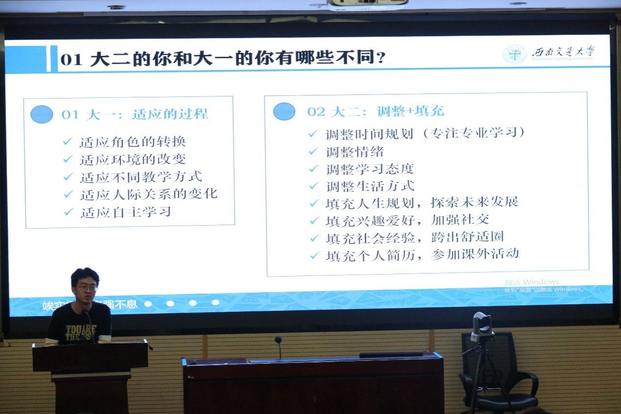 最后,他围绕同学们提出的成长困惑以及关心的问题进行了有针对性的引导,并在多个方面作出提醒。在健康方面,他强调老员工应该提高身体素质,加强体育锻炼,同时也要注意心理健康,遇到困扰及时和辅导员沟通;做到规律作息,合理饮食。在学习方面,同学们应注意第二课堂学时的修读和英语四六级备考,并利用学校图书馆、智慧就业网等资源。在生活方面,切忌使用违章电器,务必遵守学校的规章制度,注意寝室卫生和人际关系处理。