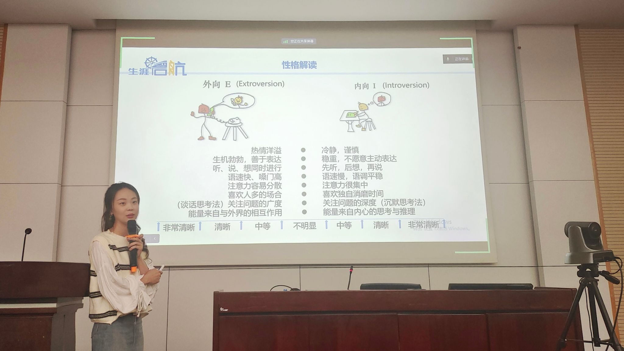 首先,张先凌为同学们带来“生涯启航”计划第四期——职业性格探索解读。张老师为同学们介绍如何利用北森生涯测评系统进行职业性格测评,鼓励同学们积极进行职业性格探索。张先凌老师还具体讲解了MBTI性格理论,详细分析了MBTI性格理论的四个维度、性格类型、职业匹配参考等等,引导和帮助员工尽早树立职业规划意识,提升综合素养和求职能力,树立正确的价值观和就业观,提前做好学业规划和职业生涯规划。