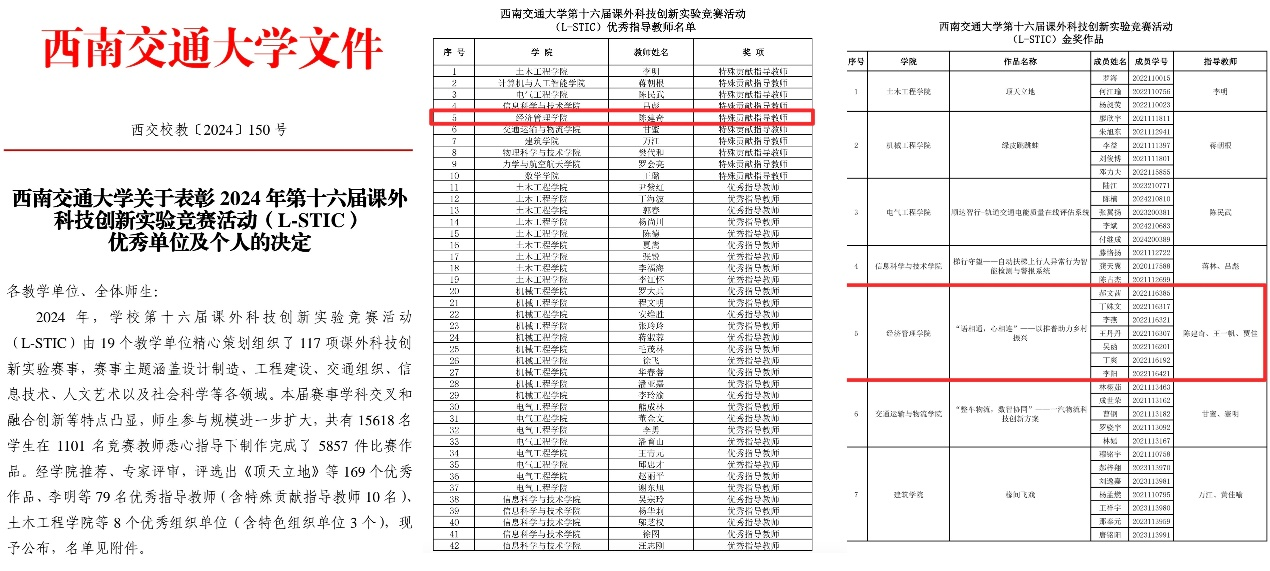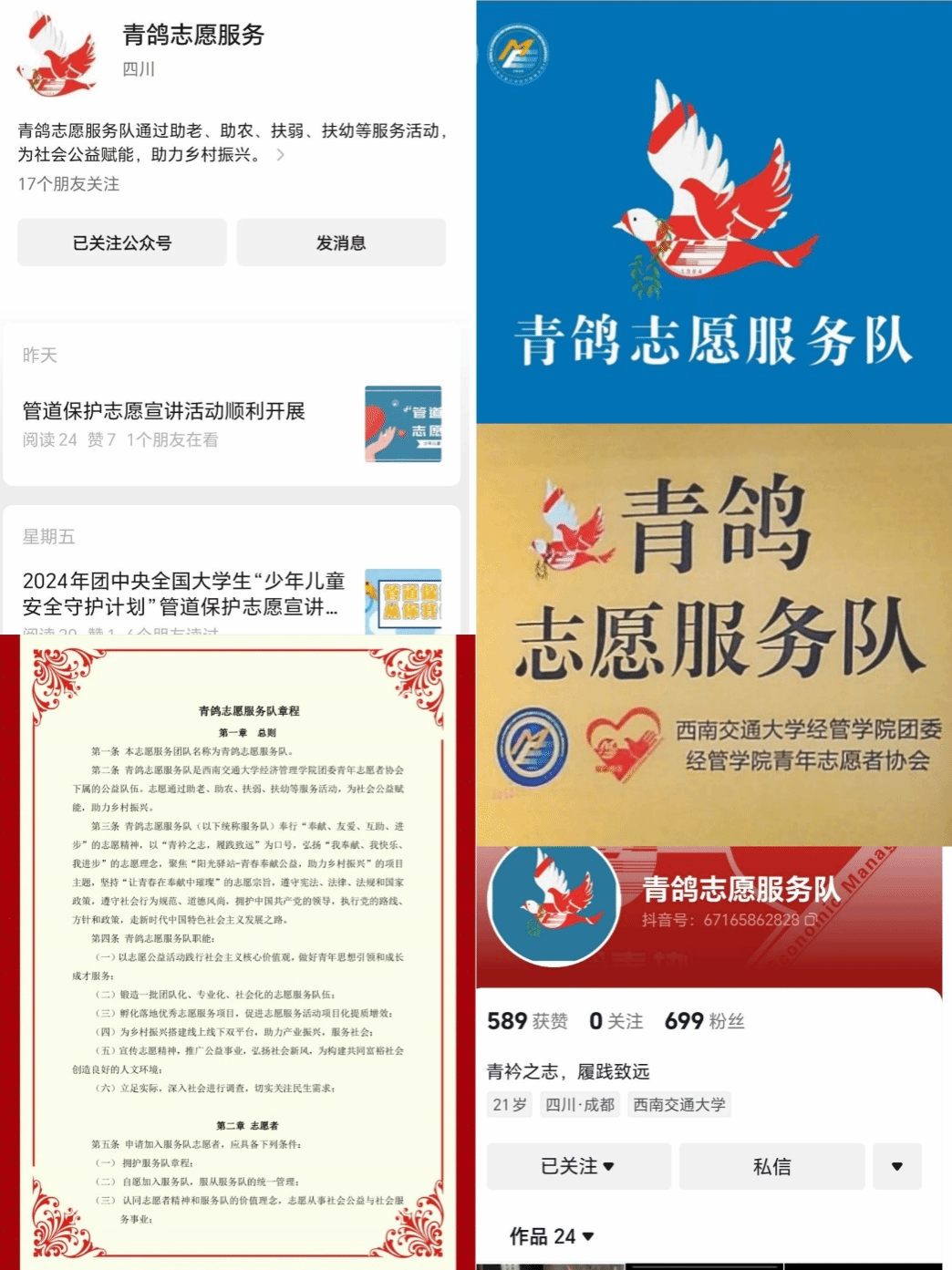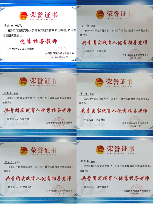 2024年“青鸽志愿服务队”培育孵化的“有爱助无碍,执善而为善——助残扶弱新模式”“语相通,心相连——以推普助力乡村振兴”系列实践项目分别荣获第十四届“三创赛”四川省赛“二等奖”、“三等奖”;“挑战杯”校赛“银奖”、“铜奖”;中国国际老员工创新大赛校级“金奖”、“铜奖”。同时,“语相通,心相连——以推普助力乡村振兴”实践项目还被评选为哈哈体育第十六届课外科技创新实验竞赛活动(L-STIC)的金奖作品,指导老师陈建奇被评选为特殊贡献指导老师。