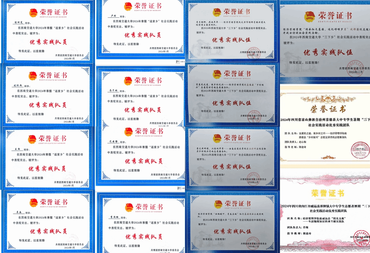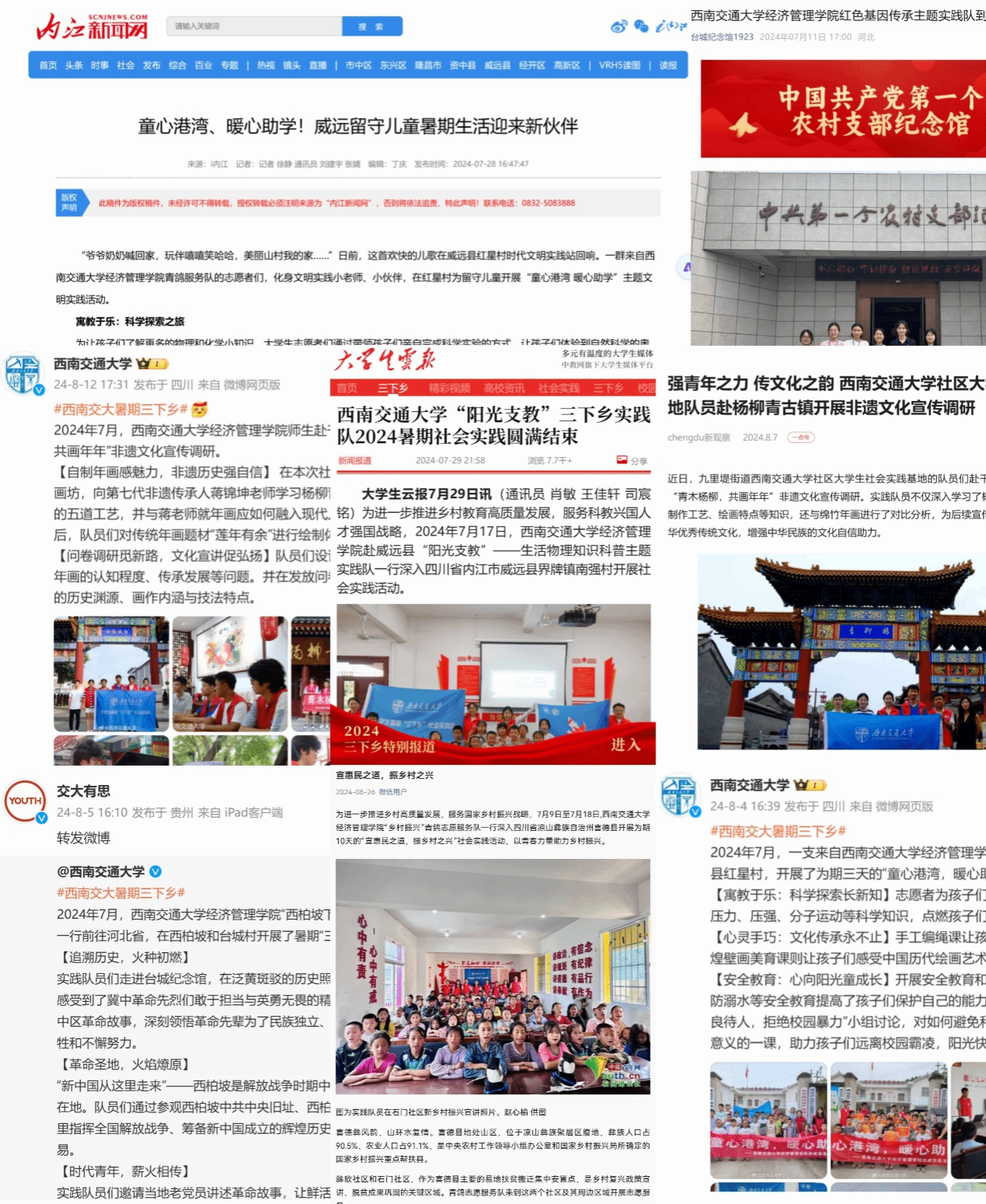 公司8支队伍获评学校寒、暑假社会实践优秀队伍,36名同学获优秀实践队员,6名老师获学校共青团实践育人优秀指导教师,收到实践地反馈信、感谢信共计20余份。实践队伍获中青校园、中国老员工网、今日头条、中国共青团官方杂志、“三下乡”官方微博等国家级报道40篇,四川法制报、四川学联、四川共青团官方微博等省级媒体报道11篇,县、市级等其他报道总计81篇。实践活动受到了社会的广泛关注,取得了积极的社会影响。同时,总结、表彰、宣传,树立典型,强化公司实践育人成效,先后发布公司实践队伍风采展新闻及推送6篇,展现了交大经管学子的良好风貌。