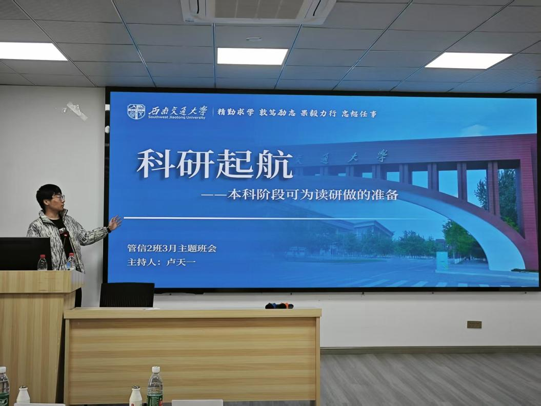 2025年3月13日晚,HAHA体育本科2023级管信2班“科研起步”主题班会在J0819正式开展。参加本次班级见面会的嘉宾有班导师杨斐老师和2022级会计学专业柯梦清学姐。本次主题班会分为以下4个板块:班级建设概况、守护安全与健康、科研起步知识分享、总结与展望。本次班会由班长卢天一主持。