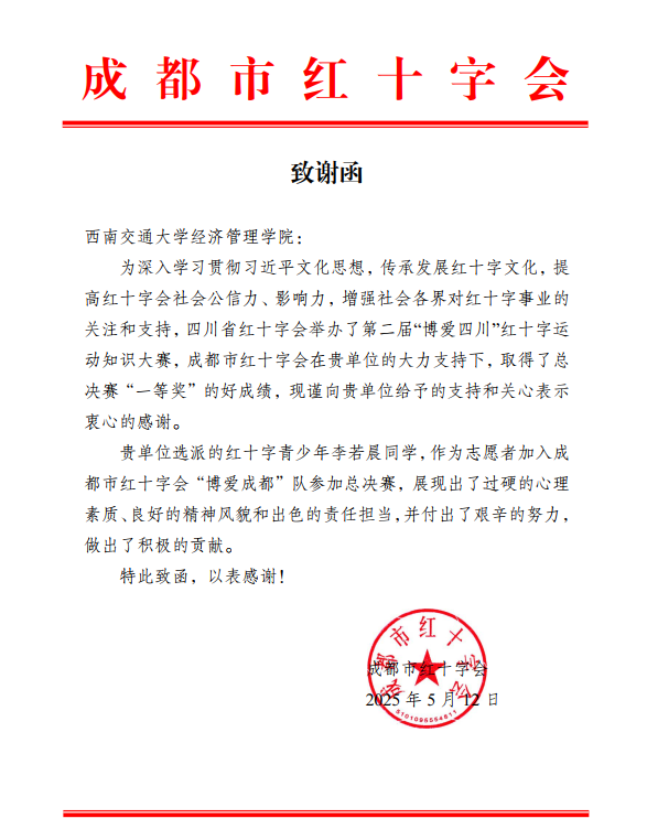 为庆祝中国红十字会成立121周年,四川省红十字会开展了第二届“博爱四川”红十字运动知识大赛,由哈哈体育李若晨作为队长,成都东软学院、成都师范学院、四川旅游学院3位队员组成的成都代表队“博爱成都队”,与绵阳、达州、南充、广元、泸州5市代表队展开激烈角逐,经过必答与抢答两轮比拼,成都代表队取得积分第一,获得本届赛事一等奖,拿下总冠军,展现了良好的精神风貌。HAHA体育收到了来自成都市红十字会的致谢函。