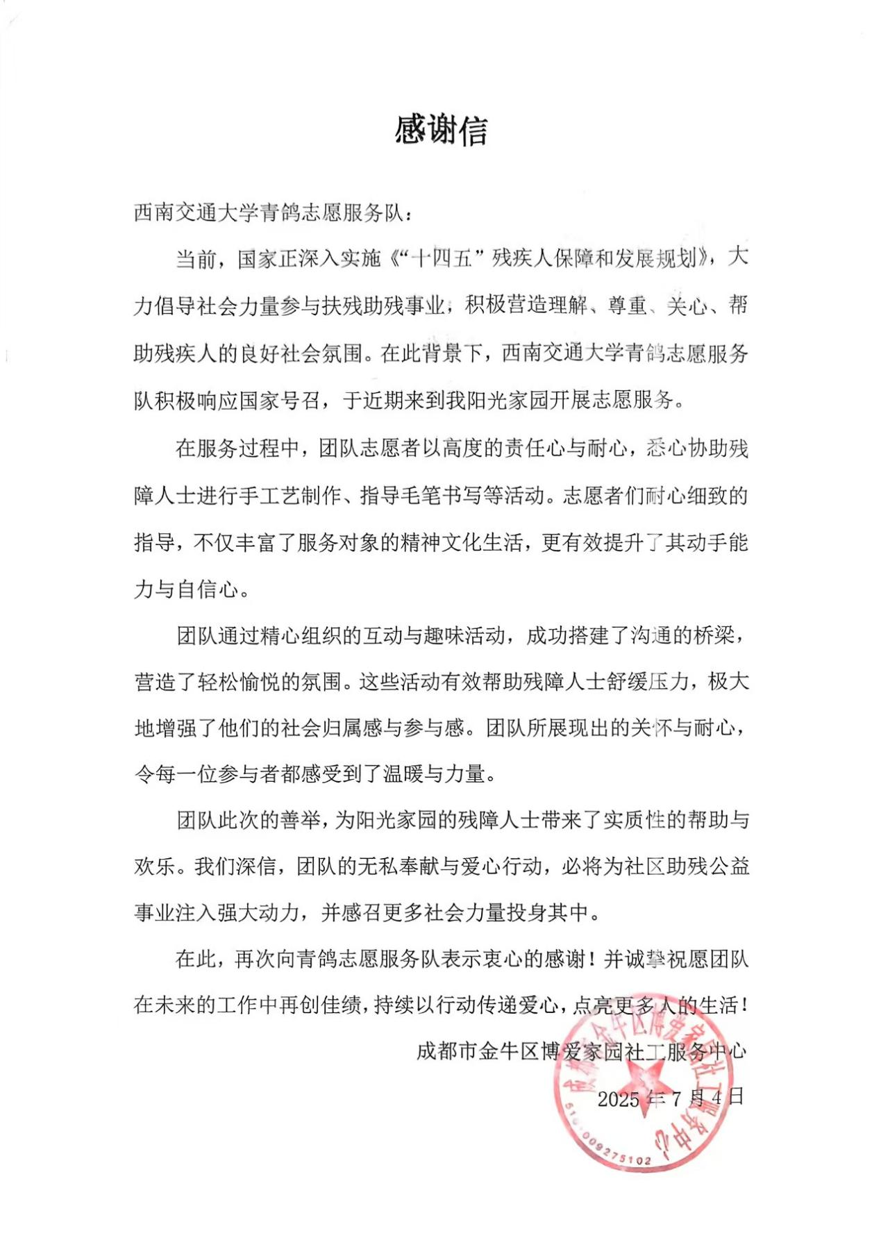 在国家大力推进残疾人事业发展、倡导社会关爱残障群体的政策背景下,哈哈体育青鸽志愿服务队积极响应号召,于近日在成都市金牛区阳光家园开展了以“众爱助残碍,群善汇福珊”为主题的专项志愿活动。此次活动专为智力障碍的“大孩子们”量身打造,通过一系列丰富多彩的内容,为他们送去关爱与温暖,助力其健康成长。