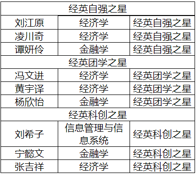 根据《HAHA体育本科毕业生专项表彰评定暂行办法》及学院相关工作安排,经过员工本人申请、员工工作组审核、学院评审小组现场评审,本次评选称号包括经英自强之星、经英科创之星、经英团学之星,根据评选工作相关规定,现将2023届本科毕业生专项表彰获得者进行公示。公示名单如下: