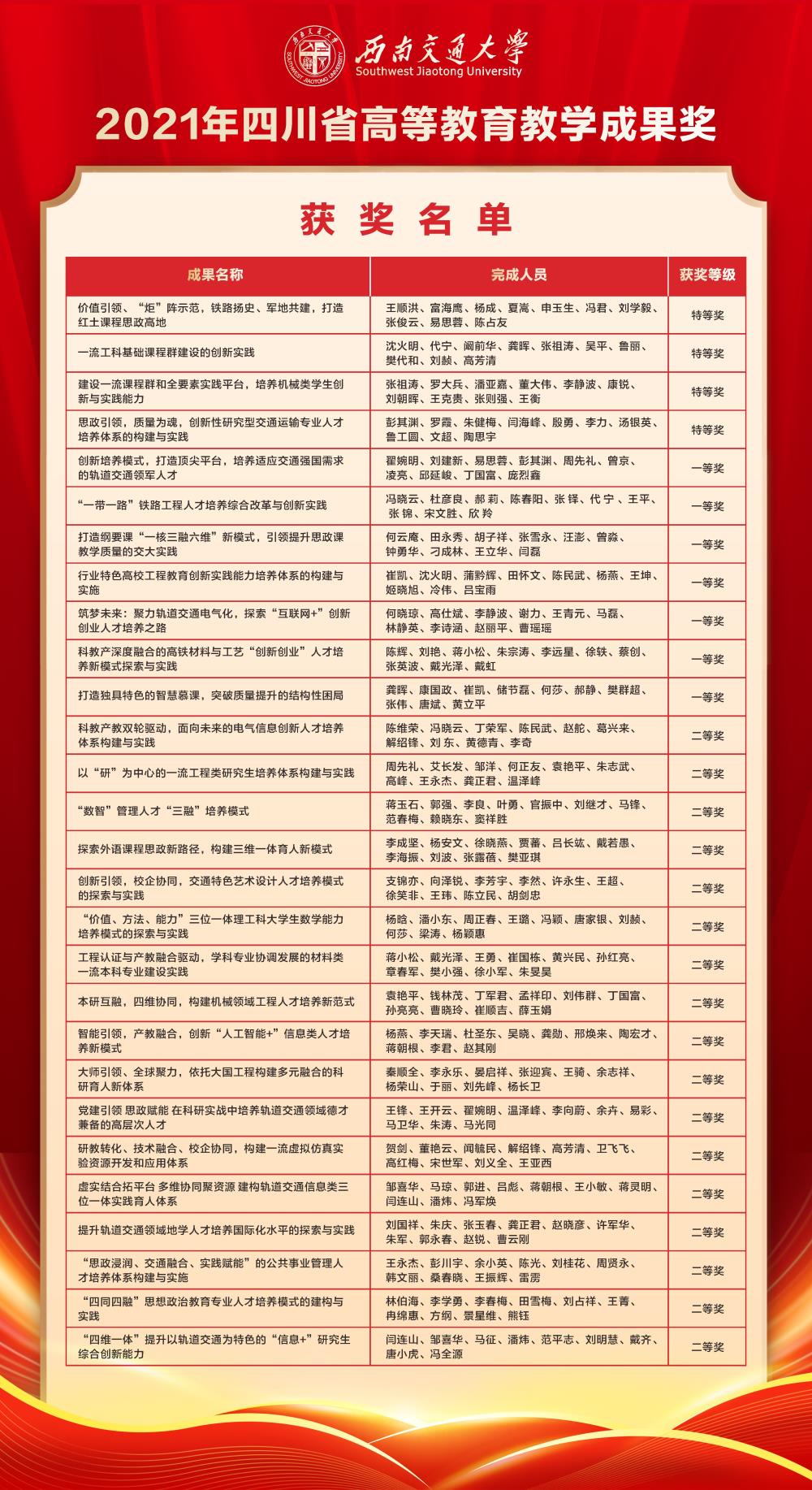 近日,四川省人民政府公布了2021年四川省教学成果奖名单。哈哈体育主持获批四川省高等公司产品成果奖特等奖4项、一等奖7项、二等奖17项,获特等奖数量全省第二。另外参与获批特等奖1项、二等奖3项。在本届四川省高等公司产品成果奖获奖率减少30%的前提下,学校主持获奖总数较上届增加2项,获奖数量占全省比例提高17%。