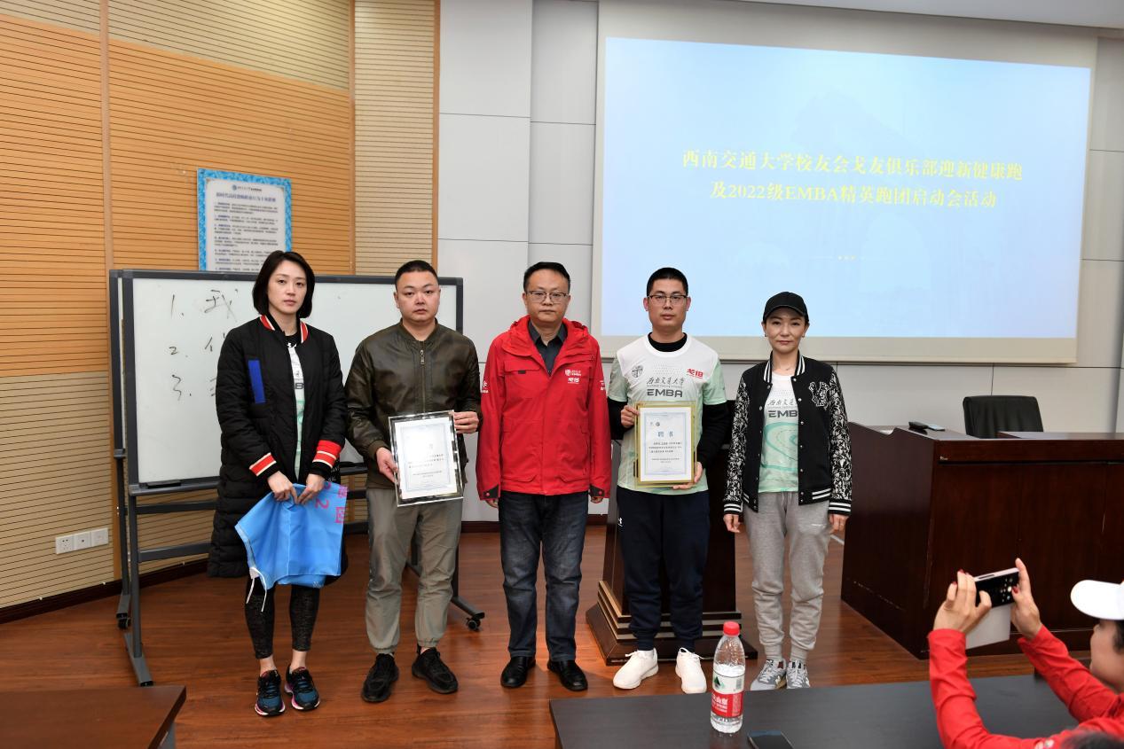 随后,举行了2022级EMBA菁英跑团授旗仪式。郭强经理授旗,并代表员工会戈友会俱乐部向2022级EMBA新生龚荣、王英博颁发了第十八届戈壁挑战赛领队聘书。