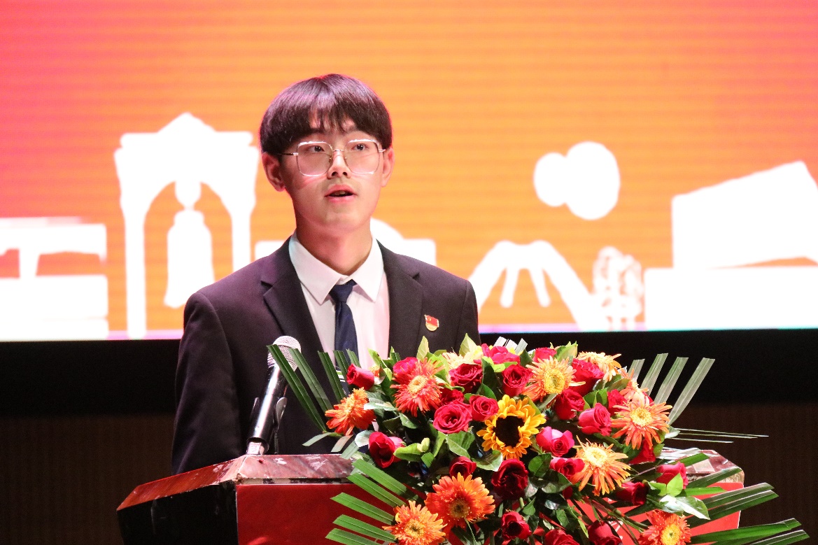 大会第四项,专业教师代表诸波发言。诸波老师结合我们现在所处的百年未有之大变局为同学们提出了三个努力方向:一是要学会学习,注重培养融会贯通的能力,努力成为一个跨学科人才;二是要与社会对话,自觉承担相应责任,学会处理人际关系;三是践行绿色生活,强身心并健体魄,保持健康绿色的生活基调。