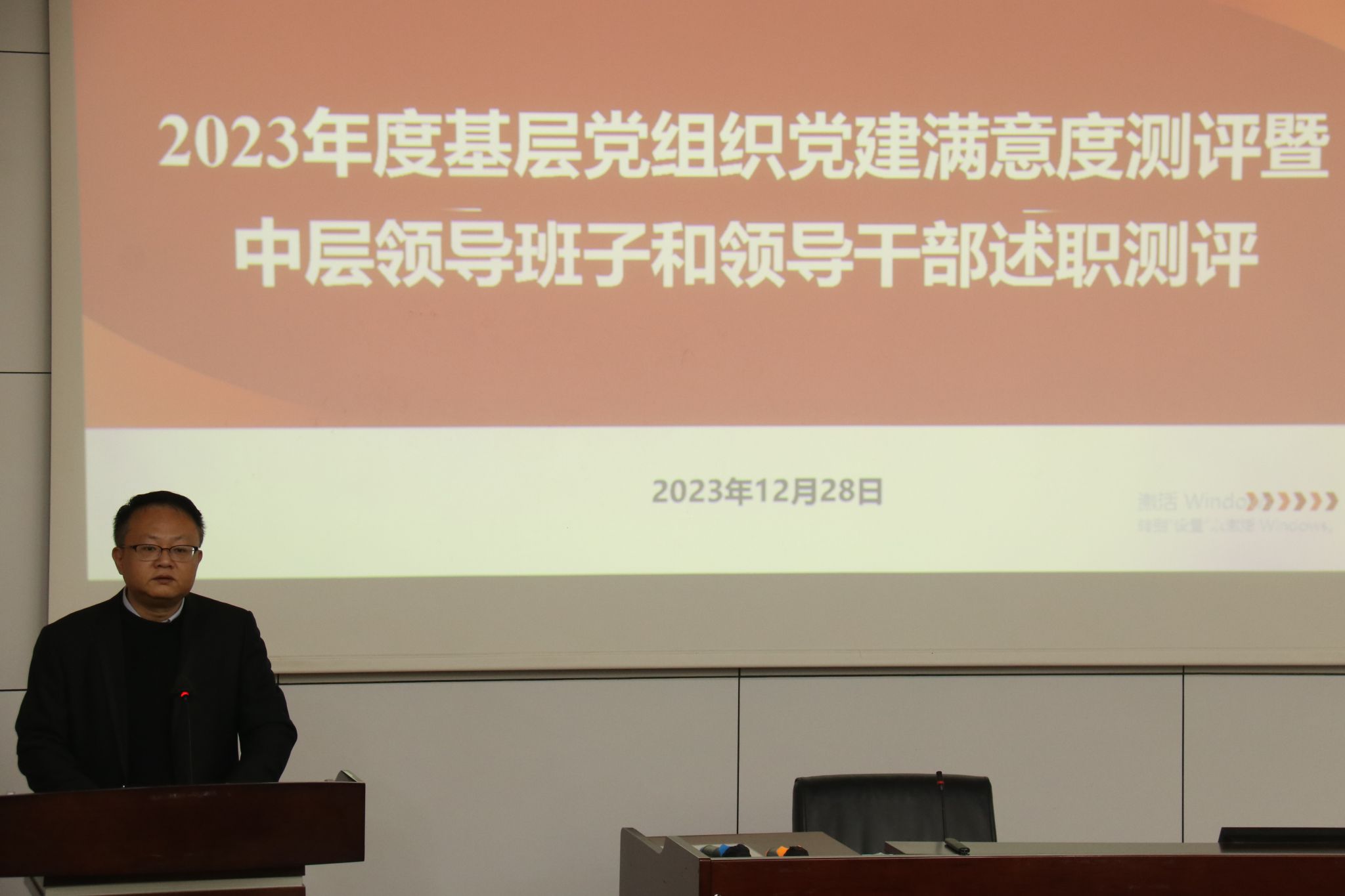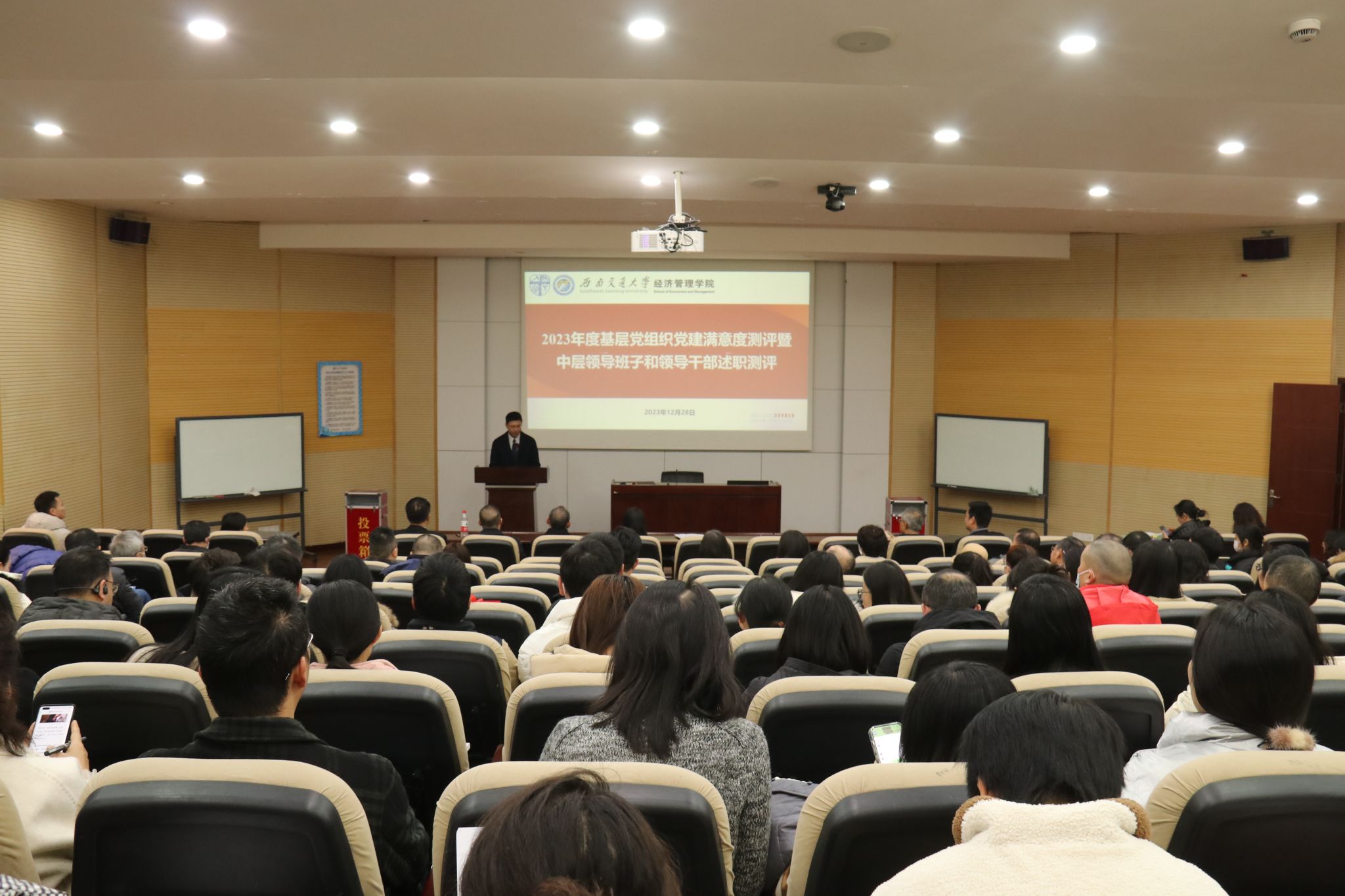 按照公司党委工作部署,2023年12月28日下午16:00,2023年度党建满意度测评暨中层领导班子和领导干部述职测评大会在九里校区0215教室召开。公司党政领导班子全体成员,学院教职工和员工党员代表参加测评,会议由公司党委书记郭强主持。