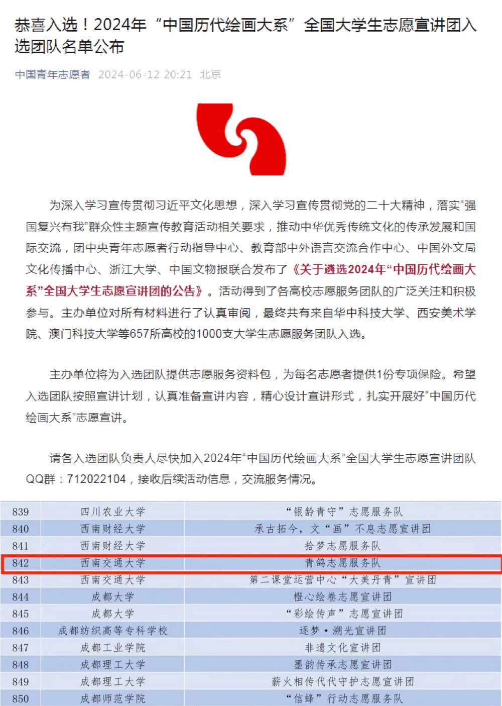 公司团委积极响应号召,积极组织员工志愿服务队报名参与遴选。近日,老员工志愿服务团队入选名单已公布,公司“青鸽志愿服务队”从全国千余所高校的几千支队伍中脱颖而出,同时入选“2024年中国历代绘画大系”志愿宣讲团和2024年关爱行动“七彩假期”志愿服务团。