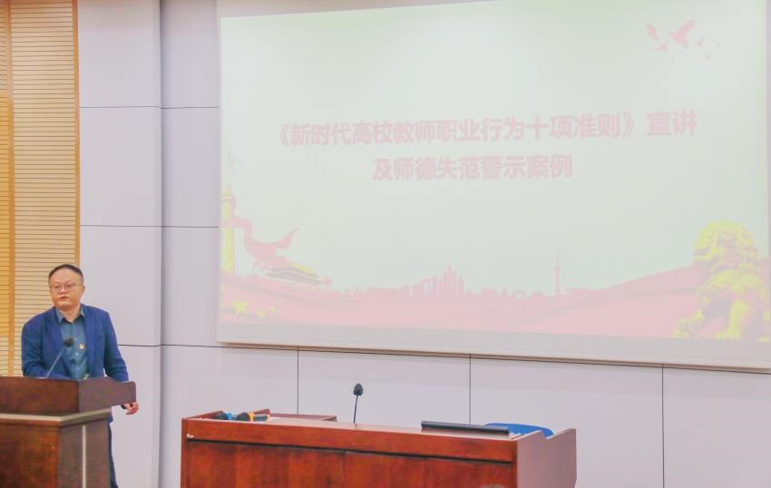公司党委书记郭强重点宣讲了《新时代高校教师职业行为十项准则》和科研诚信案例,并选取了学校纪委印发的《戒鉴》系列警示教育案例集、教育部党组编写的直属系统违纪违法典型案例汇编《戒尺》等资料中与学院专职教师群体、管理人员群体直接相关的典型案例,进行有针对性的警示教育。郭强强调,全体教职工要以高度的责任感和使命感,提升自身的职业素养和廉洁自律意识。