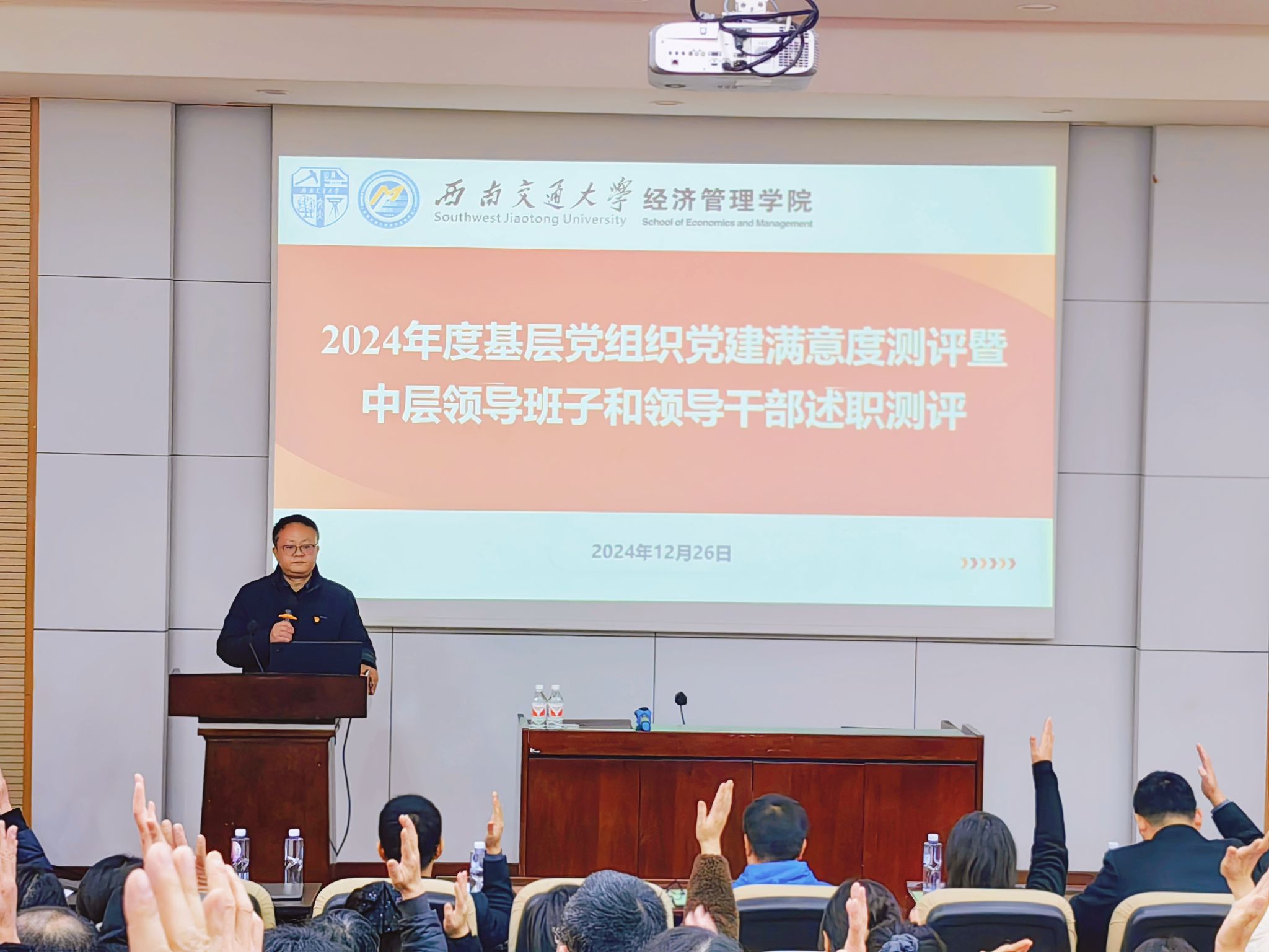 2024年12月26日下午在0215报告厅,按照学校工作部署,公司召开2024年度党建满意度测评和中层领导干部考评暨2024年双代会。公司党政领导班子全体成员、学院教职工和员工党员代表参加测评,会议由公司党委书记郭强主持。