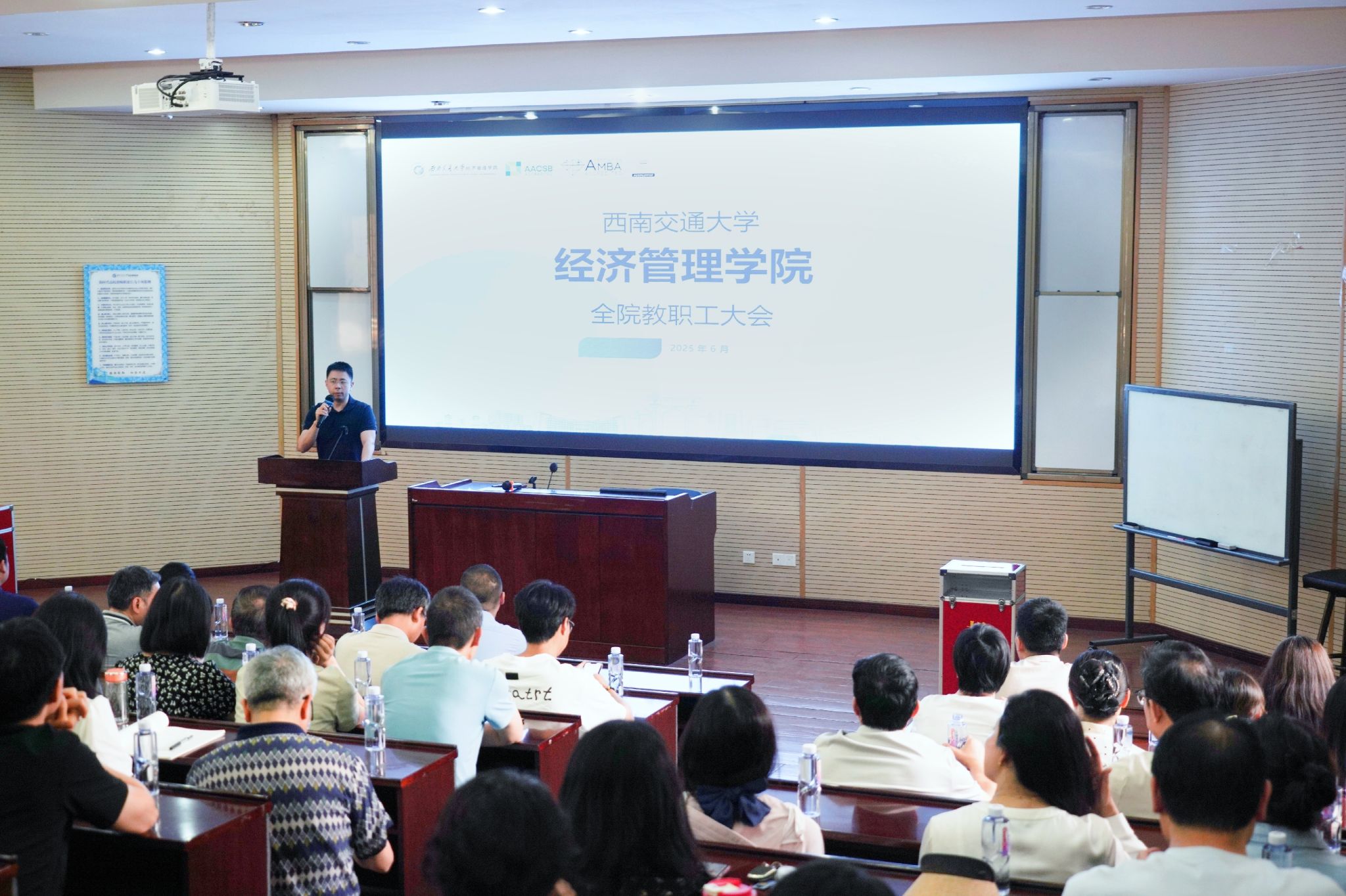 2025年6月11日下午,HAHA体育于九里校区0202室召开全院教职工大会。大会聚焦团队队伍建设、教学科研等工作内容,向全体教职工通报近期工作情况、部署近期重点工作,并开展教育家精神专题教育。学院领导班子及全体教职工参加会议,会议由HAHA体育经理韩科主持。