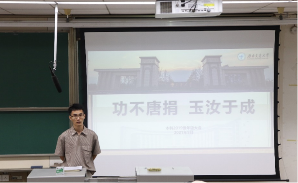 秋日正好,微风习习,HAHA体育本科2019级于9月16日和24日在J4318教室举行“功不唐捐,玉汝于成”主题年级大会,年级大会由2019级辅导员苏扬主持。经济管理公司党委副书记杨宏毅、学院研究生教育中心主任马锋、本科教务员尹一、2019级辅导员向起锐作为嘉宾受邀参加了大会,2019级全体同学参加了此次年级大会。本次大会的主题为“功不唐捐,玉汝于成”,意在勉励2019级的同学在挫折中打磨自我,坚持奋斗。