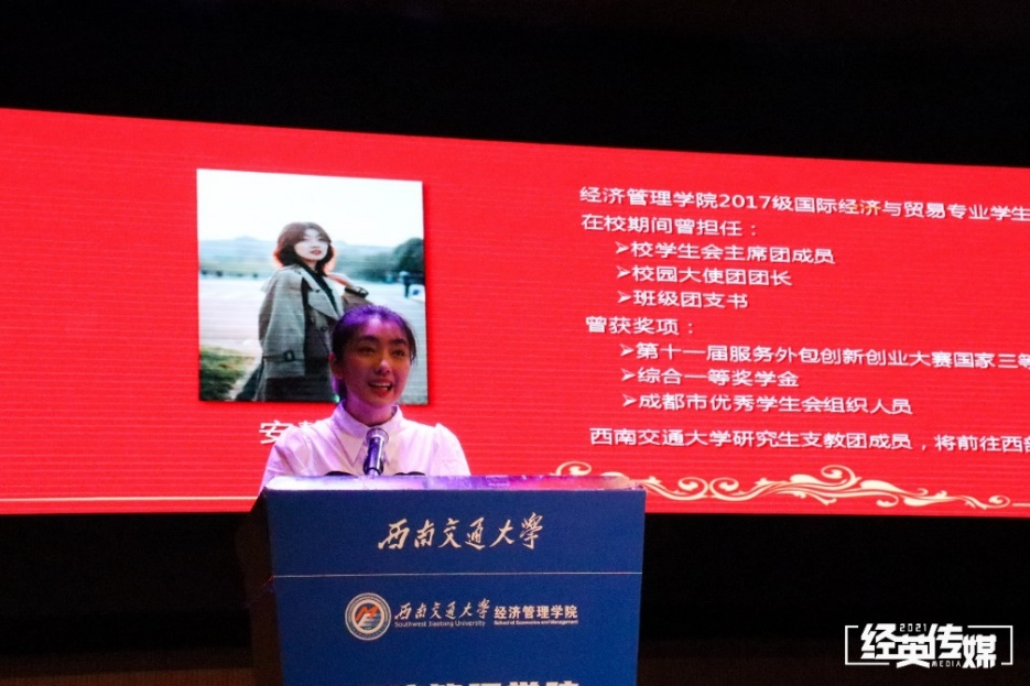 研究生支教团员工代表、2017级国际经济与贸易专业安静泽作了成长报告。她向学校和老师们表达了自己诚挚的感谢,向同学们表达了祝贺与祝福。她分享了自己的大学历程,她说:“一代人有一代人的长征路,一代人有一代人的担当,实现中华民族的伟大复兴路就是我们这一代人的长征路,走好西南交大人的长征路,要永远怀揣一颗努力奋斗的心。”