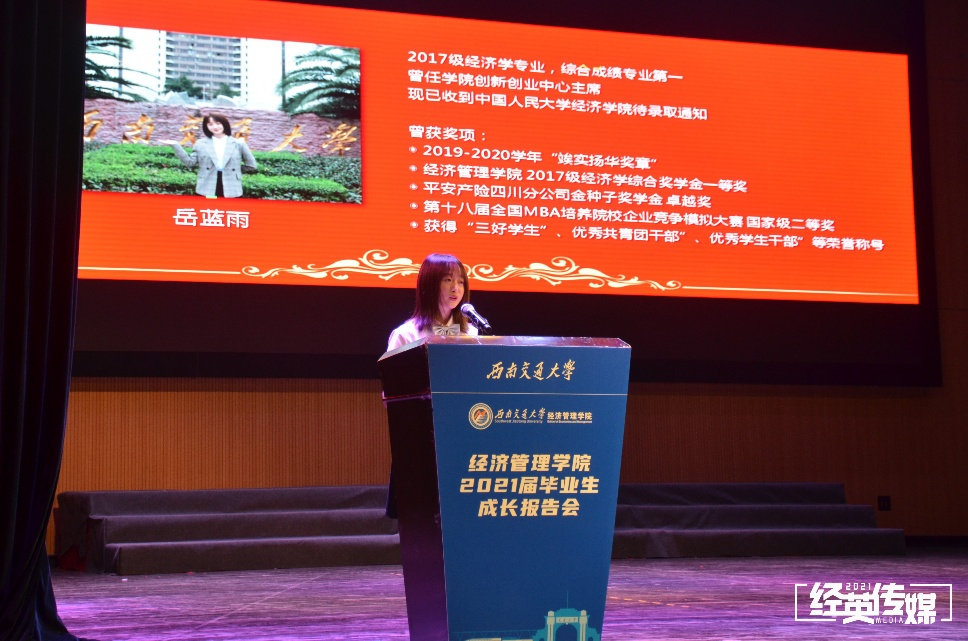 第二部分为毕业寄语,由范春宇、韦姝卉两位毕业生主持。会堂大屏幕首先播放了由2021届本科毕业生参演的纪念MV《入海》,讲述经管学子在九里校区的故事。他们走过懵懂无畏的大一,成长于意气风发的大二,成熟于淡定内敛的大三,收获于硕果累累的大四,未来也必将以梦为马,不负韶华。接着,大屏幕播放了2021届本科辅导员寄语视频。在视频中,每一位辅导员都送上了自己最美好的祝福与期许。最后,大家跟随2021届研究生纪念视频,一起步入回忆的长廊。大学的征程就像是一幅画,每一位毕业生都是这幅画的原创者,衷心祝愿每一位毕业生都将在充满期望的明天,谱写更华丽的篇章。