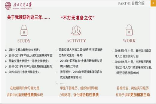 活动开始,首先进行分享的是邓舒文学姐,邓舒文学姐曾获得过唐立新奖学金等各类不同层次的奖学金,并被保研至四川大学,获得过创新创业类及科技类奖项十余项。可谓品学兼优,全面发展。不仅如此,由于她有在上海全筑建筑装饰集团担任认识行政助理的工作机会,使得她能够自然地将在校内培养的品质运用到了工作中去。邓舒文学姐,以自己的简历模板为例,向我们进行了简历描写的讲解,使我们能够在以后寻求工作中,较为轻松地迈出第一步。看着学姐丰富的大学阅历,更加坚定了同学们时不待我,积极进取的决心。好的简历,不仅要有规范简洁的模板,更需要丰富的内容填充其中。除此之外,邓舒文学姐还从开放谦逊,务实敢为,追求极致等方面结合自身在实习过程中遭遇的问题和取得的成就,向我们系统地讲述了我们需要在未来职业生涯及工作岗位上学习,培养的综合素质。大家听了都觉得受益良多。最后邓舒文学姐建议我们“趁早地去做一些自己未来规划的想法”,因为“有规划的人会走的更快一些”。听完学姐饱含真情的分享,相信每一位在场的同学都和我一样印象深刻。