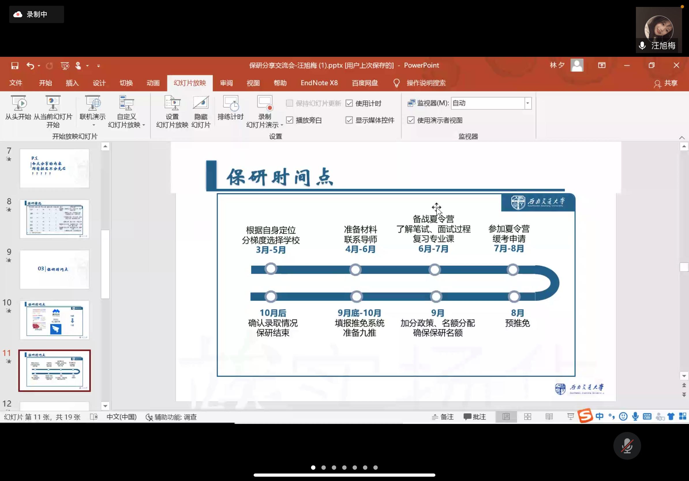 在嘉宾分享环节中,来自金融专业,保研至上海财经大学的林子渊学长和张炜尔学姐通过其个人夏令营经历、校内外保研条件、保研材料准备以及金融院校选择的分享,为同学们提供了详细的建议,并着重讲解了申请专家推荐信的方式。随后,来自信息管理与信息系统专业,保研至武汉大学的汪旭梅学姐和来自国际经济与贸易专业,保研至厦门大学的邓茗心学姐又从不同角度给同学们分享了复习经验、保研流程及保研时间点等相关信息,并提出了很多具有针对性的建议。