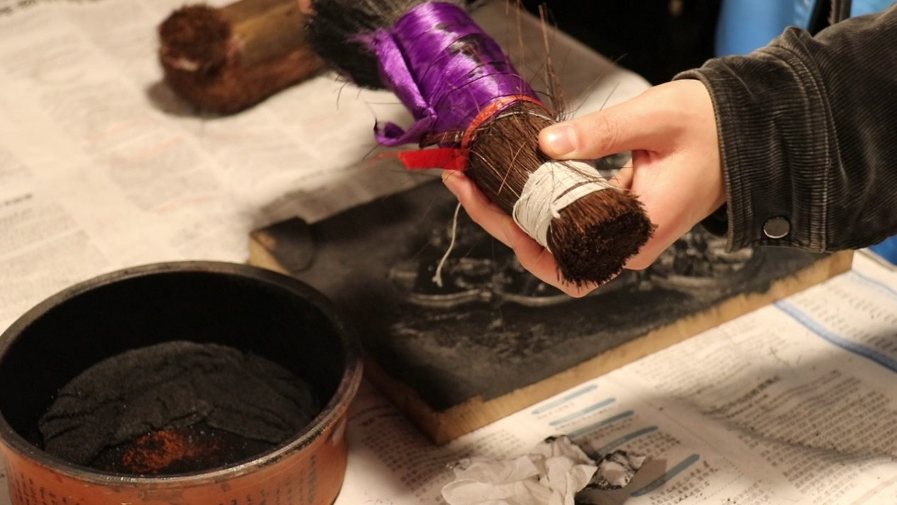 实践出真知,在对年画有一定的深入认识与了解后,团队成员亲自体验了部分的年画制作流程。切身体会后,同学们无一不感叹年画制作真是一项技术活!从起稿、刻板、印墨、施彩与印花,绵竹年画制作的每一项工艺都需要高超的技艺。