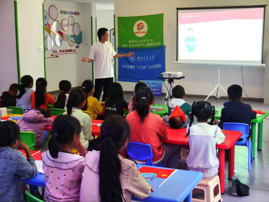第四天,实践队在社区开展了推普文化小课堂。队员们用形象生动的表演向孩子们表述学好用好普通话的重要性;通过趣味识字、诗歌朗诵、绕口令、击鼓传花等趣味活动,寓教于乐,寓学于趣,带领员工巩固单、多音节发音,引导员工体验普通话的形美韵美音美。队员们与孩子们高效的课堂互动,创造了良好的语言交流环境,不少孩子纷纷上台用普通话讲述自己的家乡和梦想。随后,队员为孩子送上纸和笔,帮助孩子们用手中画笔描绘自己的家乡,引导孩子用普通话分享自己对家乡和祖国的热爱。
