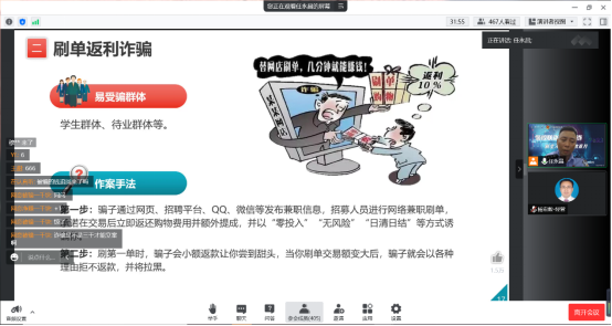 首先,经济管理公司党委副书记杨宏毅叮嘱新生同学们,要提高对电信诈骗的重视程度,要建立起防诈骗的意识,也要从以往的实际案例中汲取经验和教训。紧接着赵警官以“筑堤九里,守护平安”为主题,从4个方面3个维度向大家普及了防范电信诈骗的基本知识。系统阐述了“什么是网络诈骗”,“为什么要防范网络诈骗”。在搞清楚“什么是”和“为什么防”后,赵警官凭借多年防诈骗工作经验为大家列举了十种常见的诈骗套路,包括刷单返利诈骗、杀猪盘诈骗、冒充熟人或领导诈骗等。不得不称赞诈骗份子手段之“高明”,让人防不胜防,也不得不唾弃其毫无底线,无孔不入。面对层出不穷,不断更新换代的“诈骗方案”,赵警官手把手地指导同学们如何识别并防范网络诈骗,将其归纳为“无法确定身份的人物使用电话、网络等工具,要求你转账汇款或者输入敏感信息”这一“公式“。凡是可以用这个“公式”描述的行为,大概率就是诈骗,就需要同学们“敬之”、远之,保持清醒、守住底线。