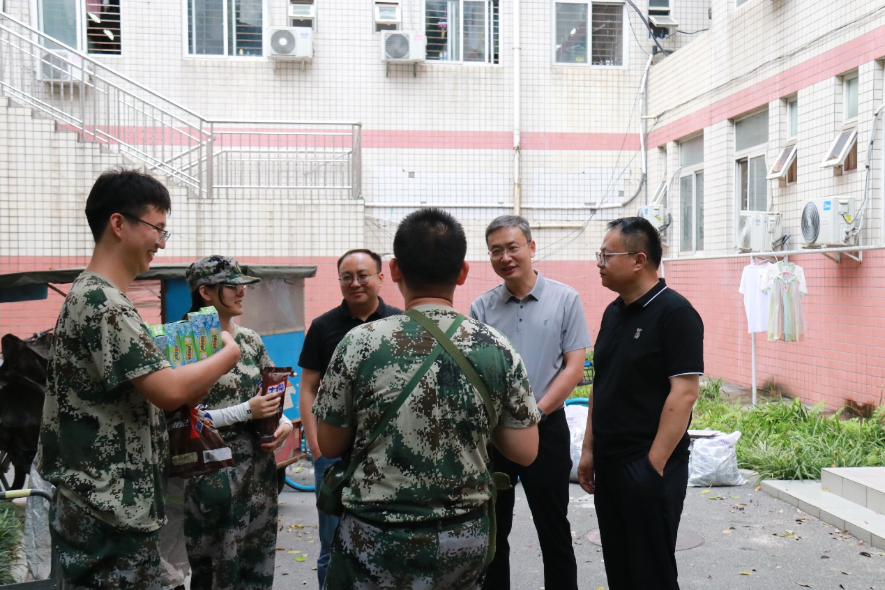 2023年8月23日,哈哈体育经济管理公司党委书记王斌、执行经理郭强、党委副书记杨宏毅及2021级辅导员张先凌、钟文婷在九里校区眷诚斋12栋2单元慰问暑期2021级军训员工。