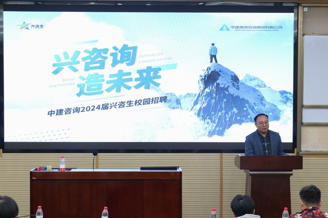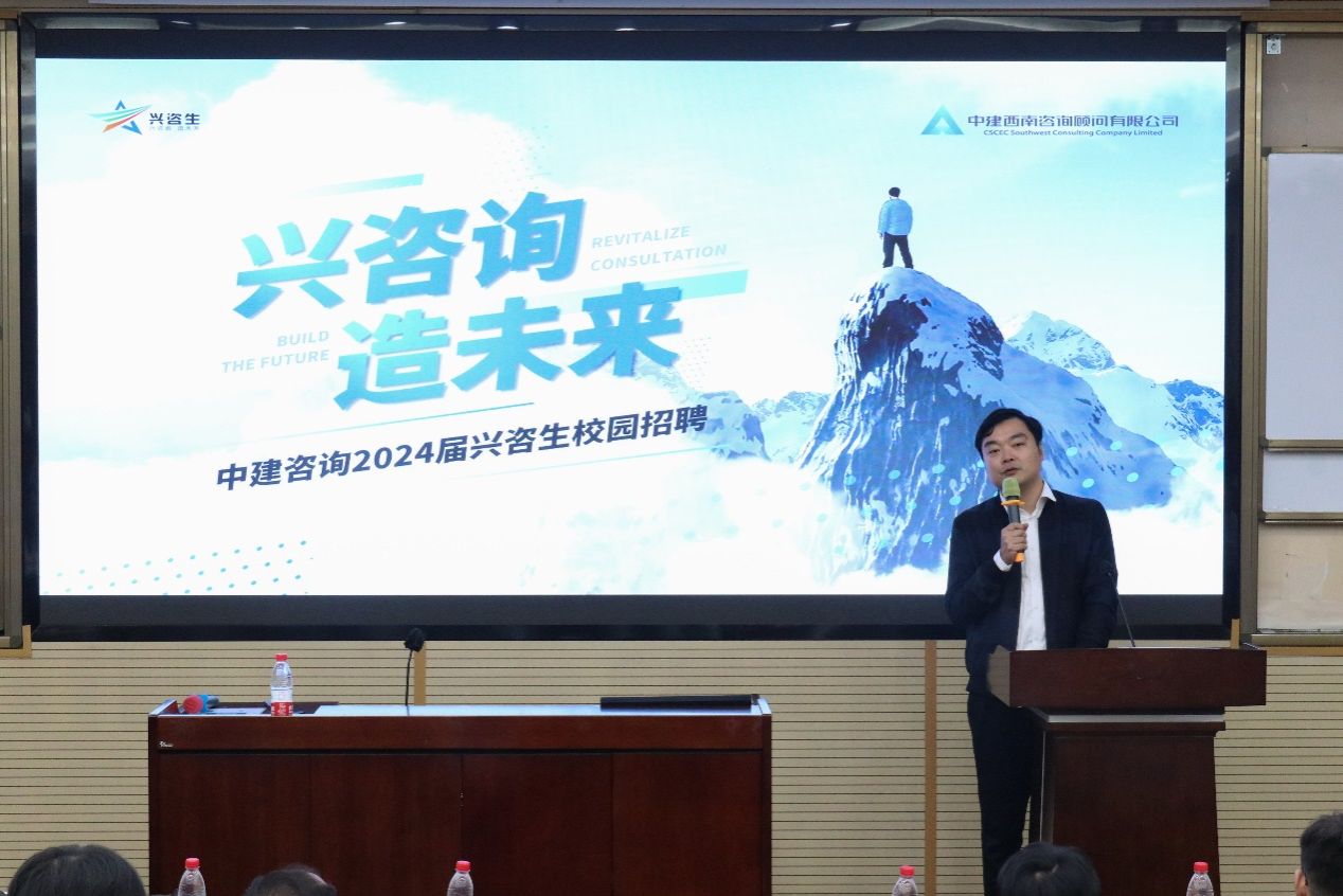 随后,景权仪详细介绍了本次招聘计划。他分别从公司信息、人才培养、校招需求、校招流程四个方面重点介绍。他首先提到,中建咨询历史悠久,走在国家经济发展前端,由中国建筑西南设计研究院、成都轨道交通集团、成都高新投资集团合资成立;第二,强调了公司对待人才的重视程度,公司建立了完善的人才评定体系,着重培养各方向专业人才,积极链接外部人才,拉长产业链,做大产业圈,强化产业链互动等;第三,中建咨询公司内部具有完善的晋升制度,晋升发展通道畅通,发展选择多样,可满足多样化职业规划,全职业生涯发展;第四,提醒投递简历的同学,提前完成中建集团的网上测试,以免造成不便。