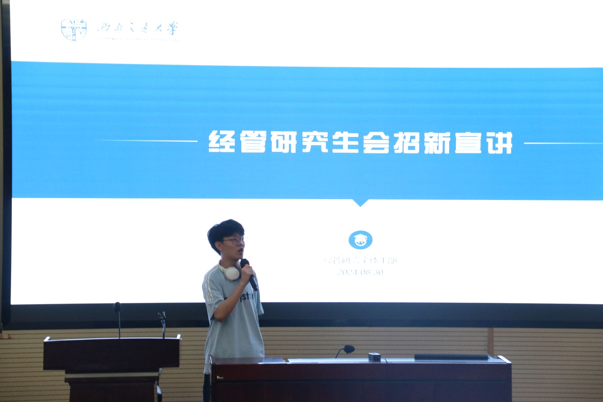 研究生会主席郑皓然给新同学们介绍了研究生自己的员工组织:研究生会(以下简称研会)。他详细介绍了研会各部门的职责和特色,并分享了加入各部门后能够获得的宝贵经验和收获。通过研会主席的生动讲解,新生们对研会的工作有了更深入的了解,也激发了他们加入研会、为校园文化建设贡献力量的热情。