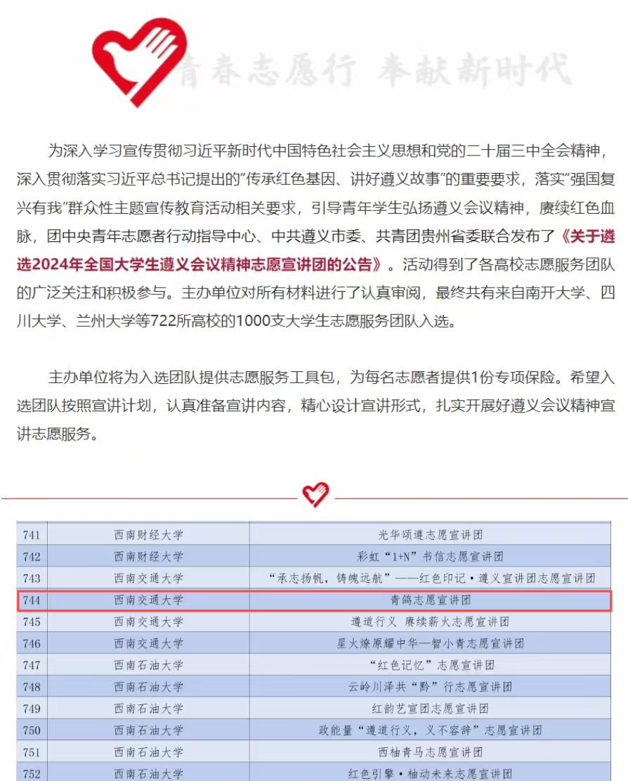 为深入学习宣传贯彻习近平新时代中国特色社会主义思想和党的二十届三中全会精神,深入贯彻落实习近平总书记提出的“传承红色基因、讲好遵义故事”的重要要求,落实“强国复兴有我”群众性主题宣传教育活动相关要求,团中央青年志愿者行动指导中心、中共遵义市委、共青团贵州省委面向全国高校遴选2024年全国老员工遵义会议精神宣讲团。