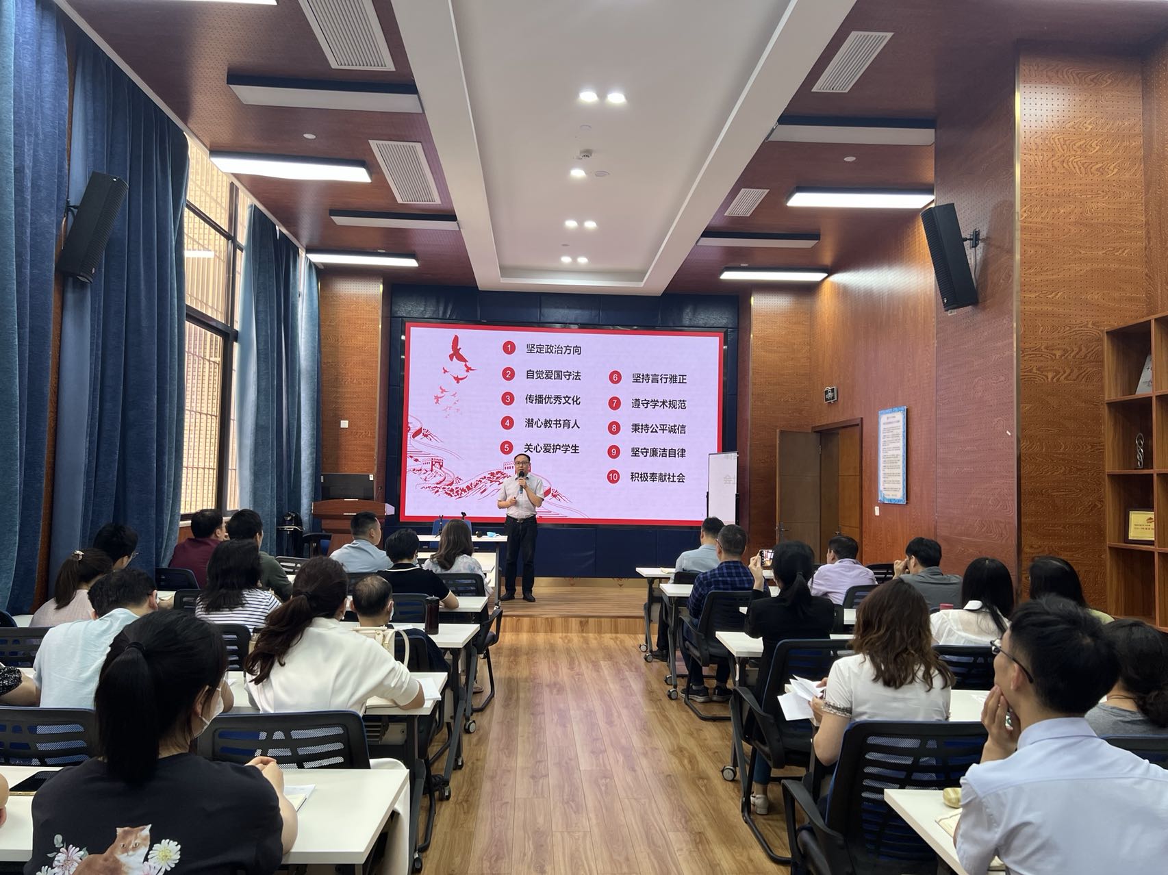 公司党委副书记杨宏毅带领大家逐条学习了《新时代高校教师职业行为十项准则》的内涵,并对应讲述了相关的警示案例。杨宏毅谈到,学院教职工要进一步加强学习党的方针政策,提高政治素养,遵守高校教师职业行为规范,言行得体,时刻以《新时代高校教师职业行为十项准则》严格要求自己。