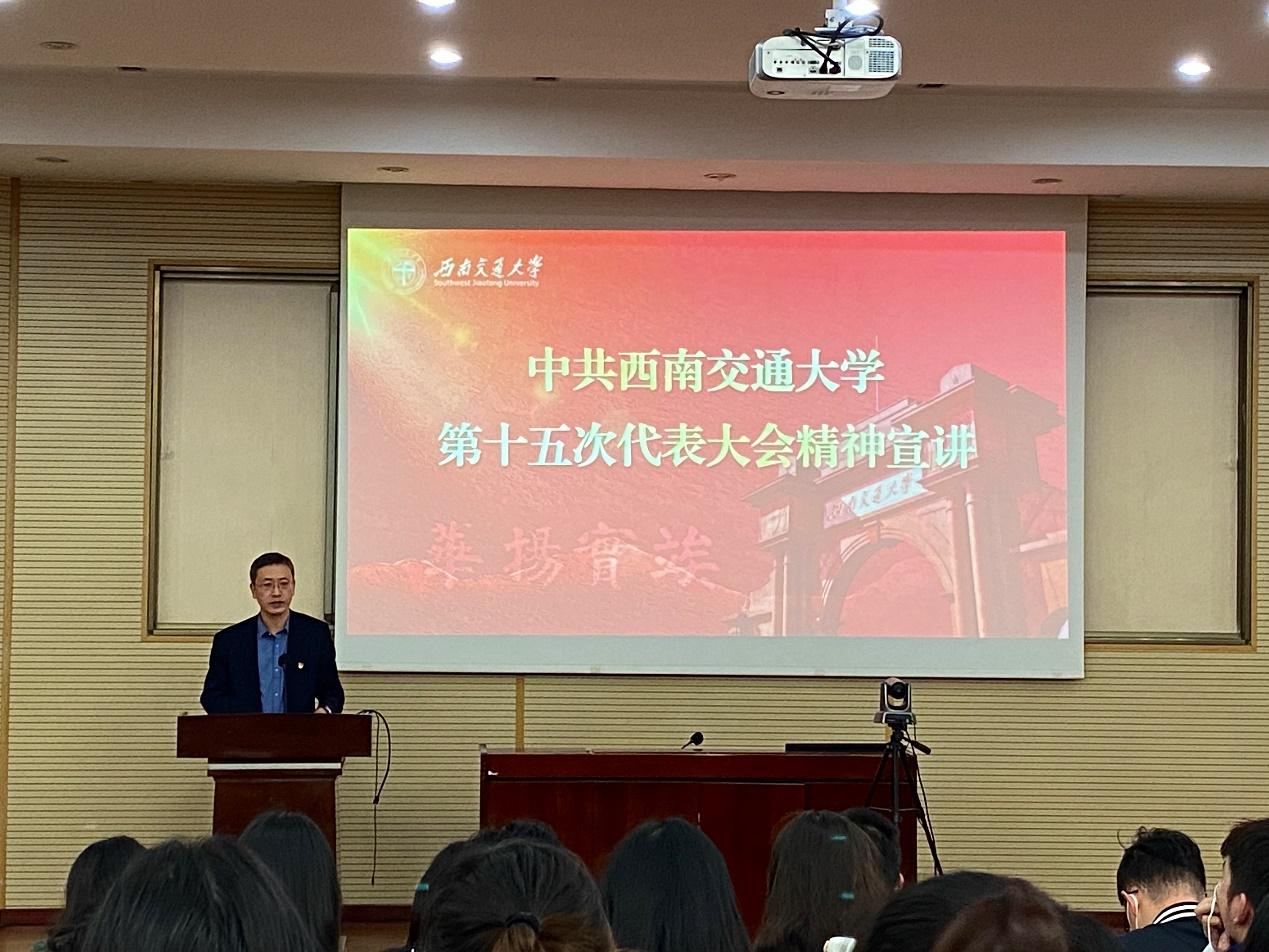 公司党委书记王斌带领大家深入学习领会学校第十五次党代会精神。学校第十五次党代会,是一次高举旗帜、牢记使命的大会,是一次解放思想、凝心聚力的大会,明确了学校新时代的办学思路、发展目标、基本准则、实现途径。王斌从学校第十五次党代会的基本概况、深刻认识第十五次党代会的重要意义、精准把握第十五次党代会的主要精神、全面加强党的建设和思想政治工作等方面进行了详细宣讲,重点带领大家学习领会了大会的主题、“五个着力建设”总体办学思路、“建设交通特色鲜明的世界一流大学”总目标、“三步走”战略安排、“五个必须坚持”办学治校基本准则,以及“谋发展、建一流,惠民生、聚民心,强化支撑与保障”3条实践途径等的内容和精神。王斌指出,全公司党员同志和师生要深刻认识学校第十五次党代会的重要意义,精准把握第十五次党代会的精神内涵;各党支部应将党的二十大精神和学校第十五次党代会精神有机结合,深入学习、深刻领会,全面推动党的二十大精神和学校第十五次党代会精神落实落地;学院师生党员要进一步强化责任担当,树立远大理想,充分发挥先锋模范作用,为学校和学院高质量发展贡献力量。