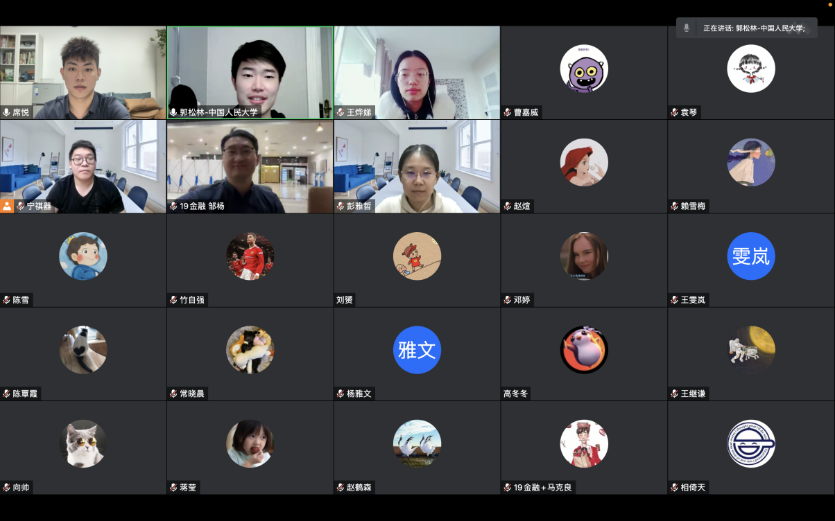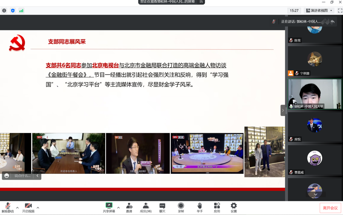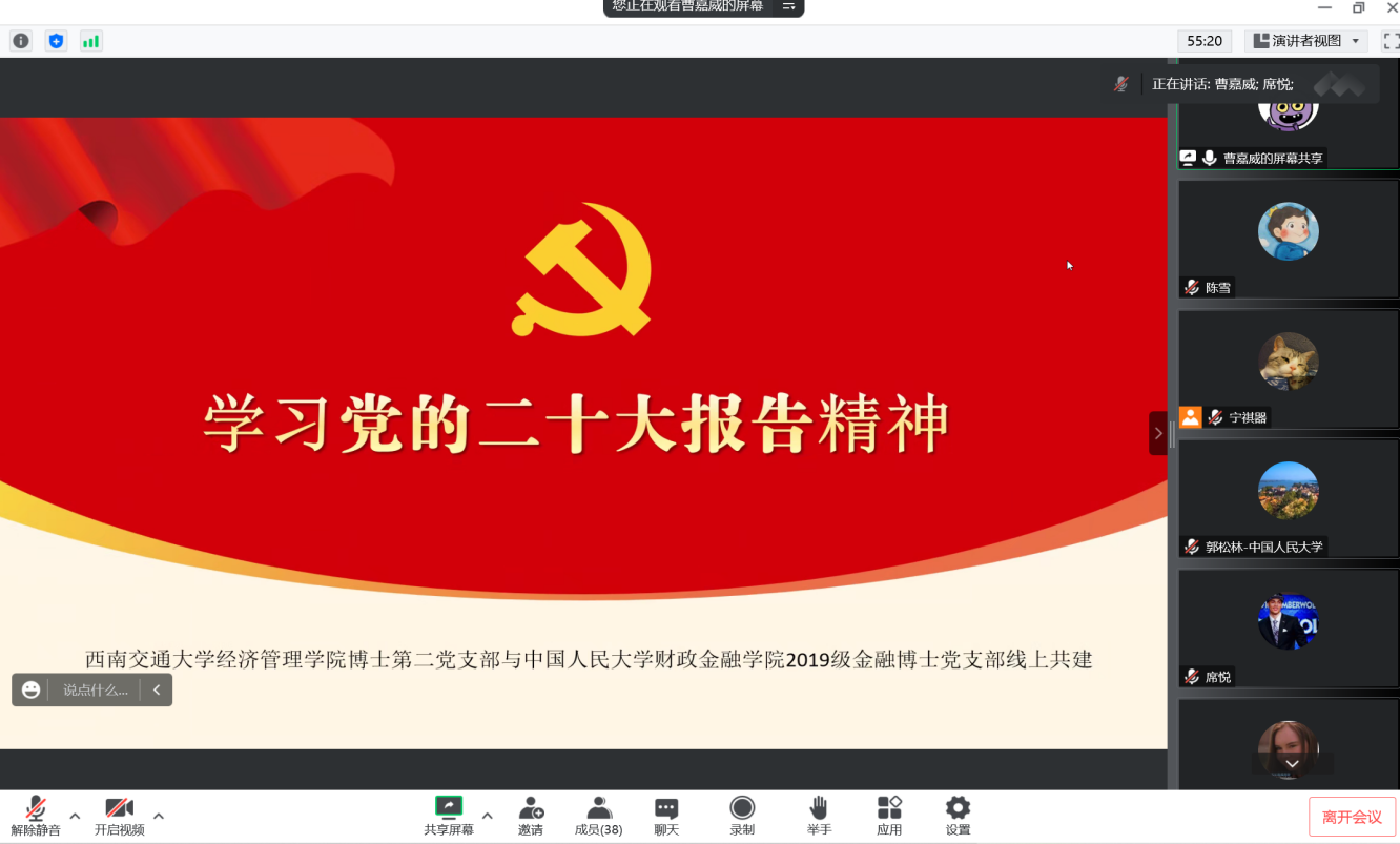 活动伊始,中国人民大学财政金融学院2019级金融博士党支部的郭松林同志表示,党的二十大是在全党全国各族人民迈上全面建设社会主义现代化国家新征程、向第二个百年奋斗目标进军的关键时刻召开的一次具有重大意义的大会。在此背景下两个党支部的跨校联合共建,共同学习领悟党的二十大精神和分享各自党支部建设的经验,也具有十分重要的现实意义。郭松林同志随后介绍了党支部的基本情况,其中包括党支部的特色工作、调研工作以及党支部同志的风采展示等。