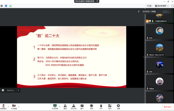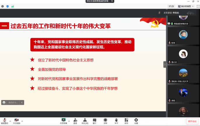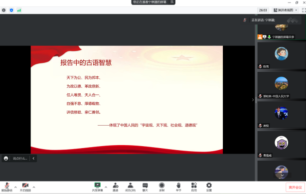 接着由中国人民大学财政金融学院2019级金融博士党支部的宁祺器同志,从三个方面带领大家学习和领悟了党的二十大报告。首先,宁祺器同志从“数”说二十大开始,为党员同志们详细介绍了党的二十大报告中的一些重要内容,其中包括:一个中心任务、第一要务、两个行、两步走、三个务必、三件大事、五项重大原则、五个“必由之路”和六个“必须坚持”。其次,结合报告中引用的一些经典名句,宁祺器同志深入讲解了中国人民的“宇宙观、天下观、社会观和道德观”。最后,宁祺器同志以习近平总书记对青年人的期盼收尾,号召员工党员应把党的二十大报告的学习与自己的学习生活实际紧密结合起来,坚定理想信念,筑牢精神之基,不负时代、不负韶华、不负党和人民的殷切期望。