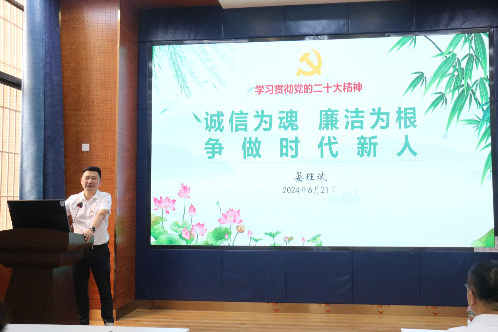 为深入贯彻落实党中央《关于在全党开展党纪学习教育的通知》精神,做好毕业生党员的党纪学习教育,经济管理公司党委于6月21日下午2:30在0218开展“诚信为魂 廉洁为根 争做时代新人”毕业生党纪廉洁教育,经济管理公司党委书记郭强同志、公司党委副书记、纪委书记晏理斌同志作相关教育工作,讲座由党委副书记余小英同志主持。