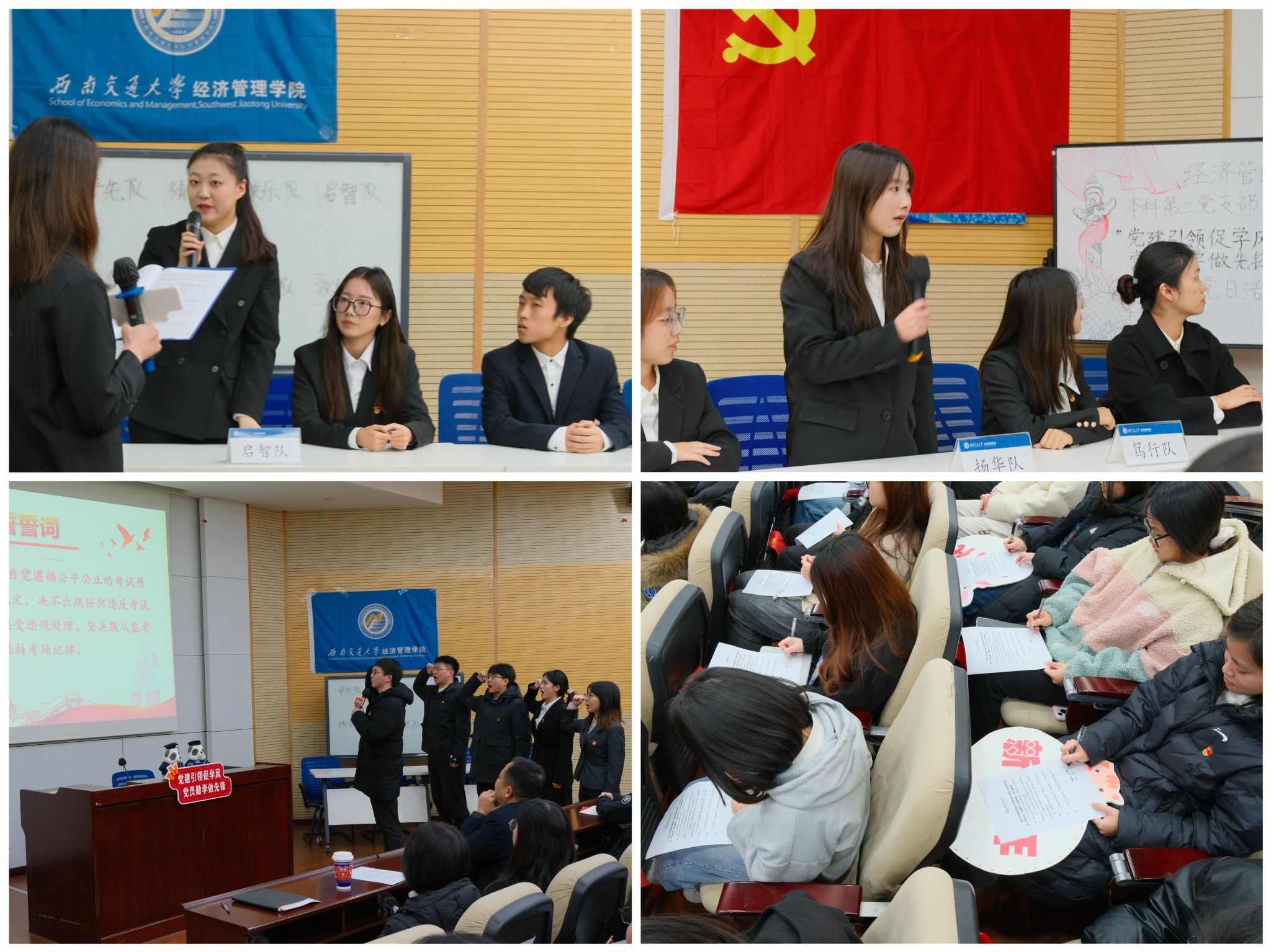 在知识竞答环节,各参赛队伍精彩比拼,踊跃竞答。最终,四支队伍表现突出,分获一、二、三等奖。随后员工代表张家栋、王驰等五位党员进行诚信考试宣誓。铿锵有力的誓词展现出学子们遵守考风考纪的坚定决心。紧接着,同学们执笔为誓,在《诚信考试承诺书》上郑重签下自己的名字,承诺以实际行动建设诚信校园,带头营造风清气正的考试氛围。