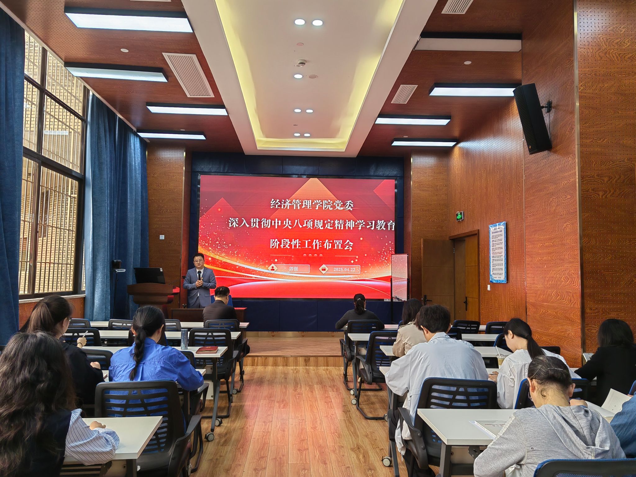 2025年4月22日,公司党委在0218教室召开深入贯彻中央八项规定精神学习教育阶段性工作布置会,公司党委书记郭强、副书记余小英、党委组织员以及师生党支部书记30余人参加了会议。