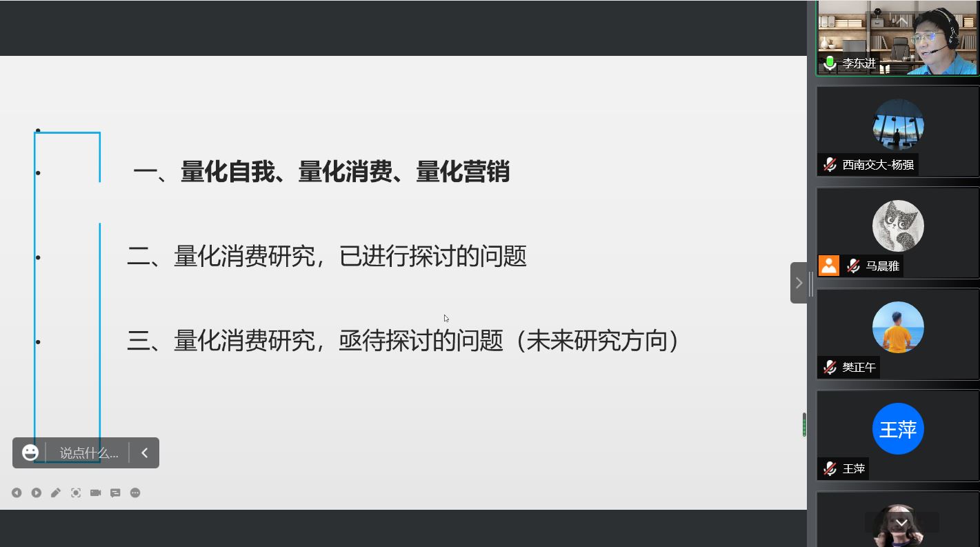 2022年5月31日晚19:30,南开大学商学院李东进教授应邀以“量化消费,到底研究哪些?”为题为公司师生进行线上学术报告。本次学术活动由学院市场学系蒋玉石教授主持,学院执行经理郭强教授以及校内外师生60余人参加了本次讲座。