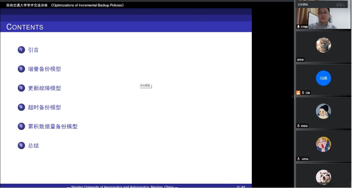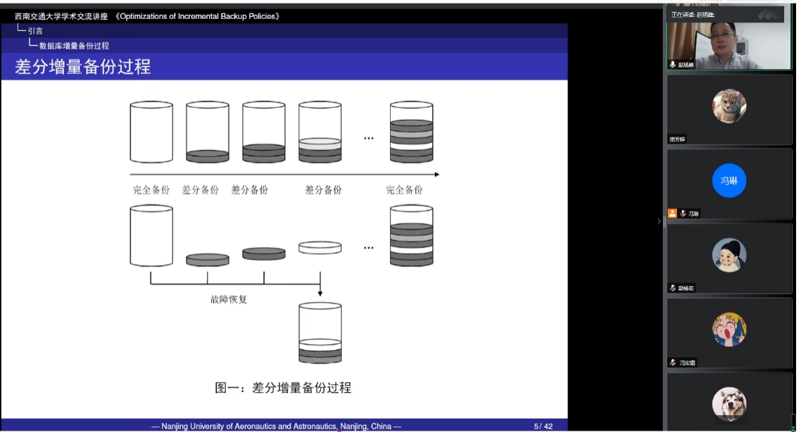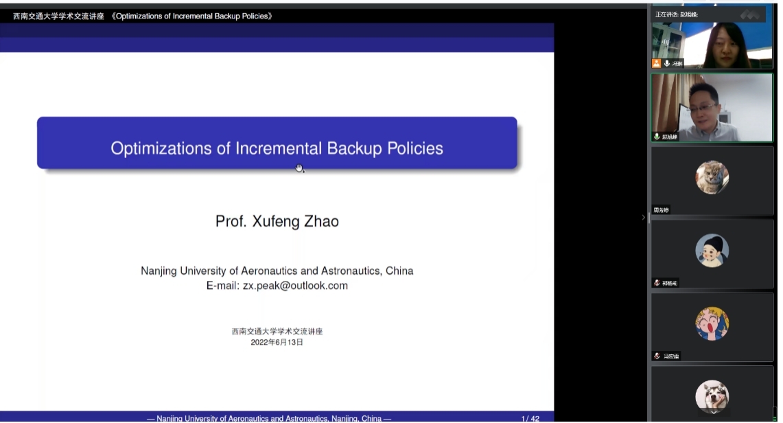 2022年6月13日下午16:00,南京航空航天大学经济与管理学院赵旭峰教授,应邀以”Optimizations of Incremental Backup Policies”为题为公司师生进行线上学术报告。本次学术活动由学院运营管理创新团队承办,冯琳副教授主持,副经理聂佳佳教授、信息系统与运营管理系系主任官振中教授以及校内外师生40余人在线上参加本次学术活动。