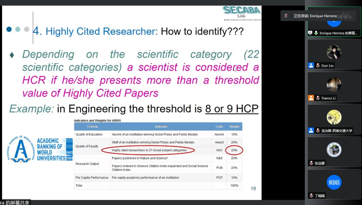 讲座分享中,Herera-Viedma教授围绕文献计量学阐述了衡量科学研究的两个主要方法:绩效分析和科学知识图谱。接着讲解并分析了H指数(H-index),高被引论文(Highly cited papers)以及高被引科学家(Highly cited researchers)在科研学术中的评估界定方法。随后教授分享了他们在SECABA实验室开发的两个文献计量学工具:H-Classics和SciMAT。H-Classics是一种基于H指数的高被引论文识别方法。SciMAT是一款可视化分析软件,主要基于文献计量指标进行科学知识图谱解析。