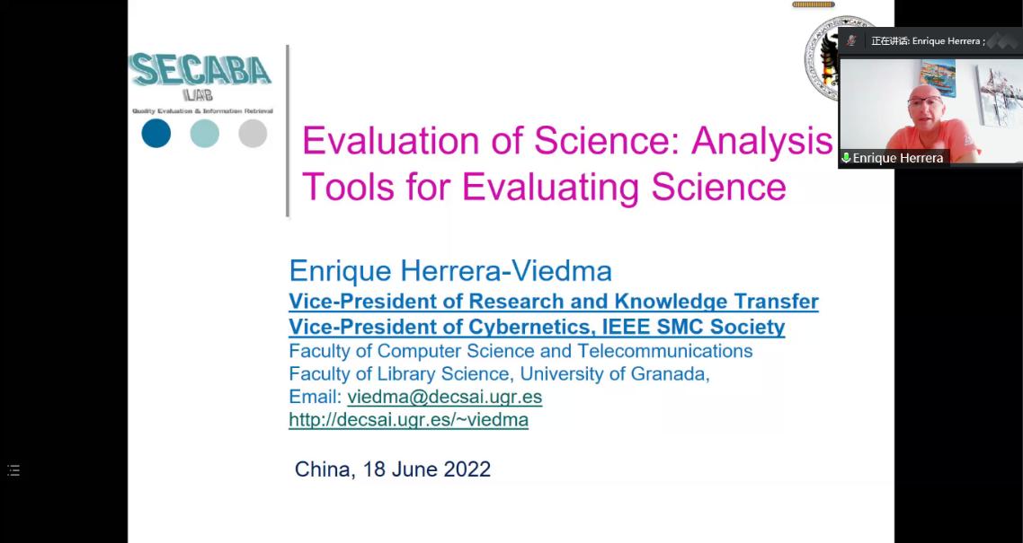 2022年6月18日下午3点,西班牙格拉纳达大学Enrique Herrera-Viedma教授应邀以“Evaluation of Science: Analysis Tools for Evaluating Science”为题为学院师生带来了一场精彩的学术分享,本次学术活动由学院信息系统与运营管理系刘盾教授主持,学院李聪聪老师及70多名研究生参加了本次线上学术讲座。
