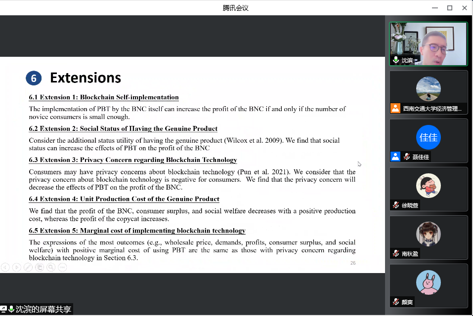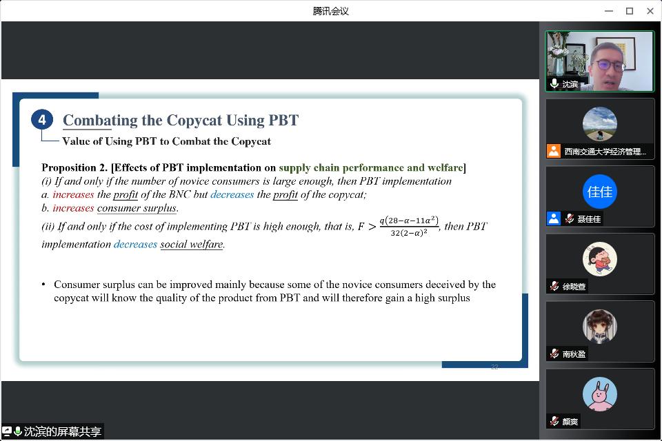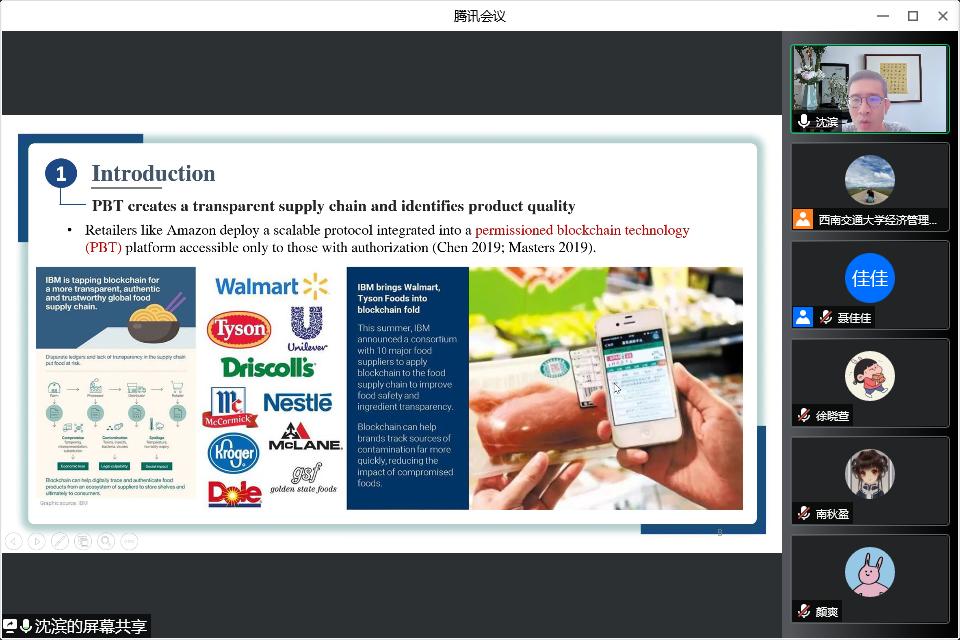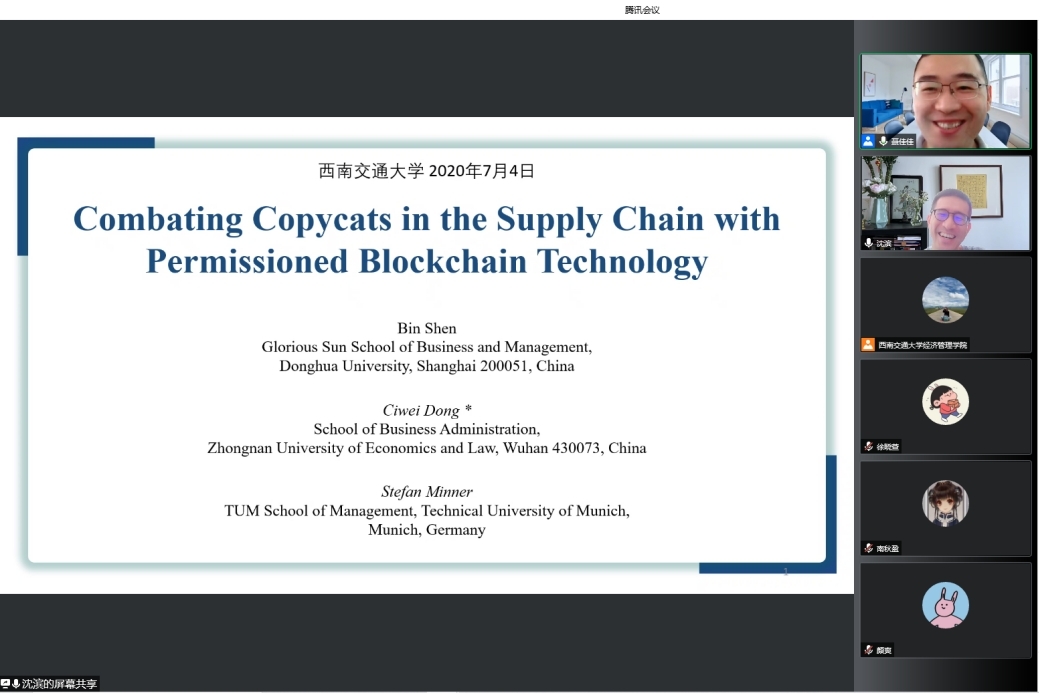 07月04日上午9:00,东华大学旭日工商管理学院沈滨教授应邀来公司开展题为“Combating Copycats in the Supply Chain with Permissioned Blockchain Technology”线上讲座。本次讲座由副经理聂佳佳教授主持,公司部分博士生和硕士生参加了本次讲座。