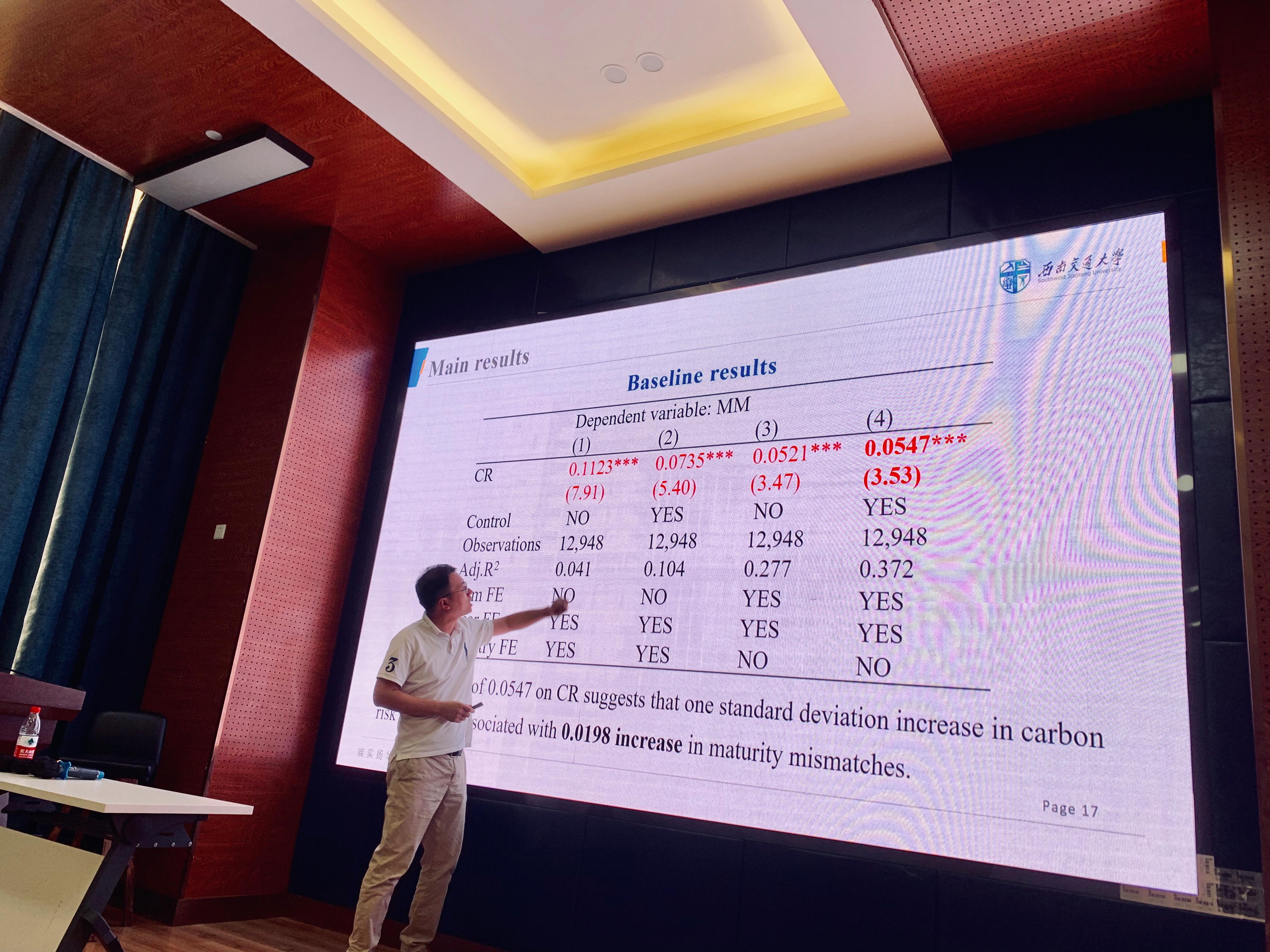 基于以上出发点,引出了文章所讨论的重点问题“碳风险会对短债长投产生何种影响?”诸老师详细的为大家讲解了模型的建立过程与实证方法,主要通过总资产的缺口规模来衡量错期匹配的程度;用碳排放量除以销售收入来代表碳强度,进而衡量碳风险,解决研究问题。