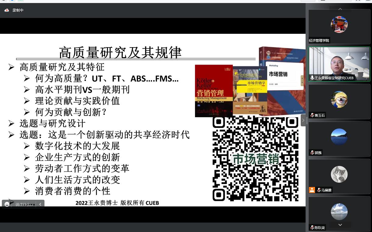 2022年10月14日下午15:00,首都经济贸易大学王永贵副董事长教授应邀以“从事高质量研究的几个看法——以共享经济下的服务创新管理研究为例”为题为学院师生带来了一场精彩的学术分享。本次学术活动由市场学系蒋玉石教授主持,校内外师生100余人参加了本次讲座。