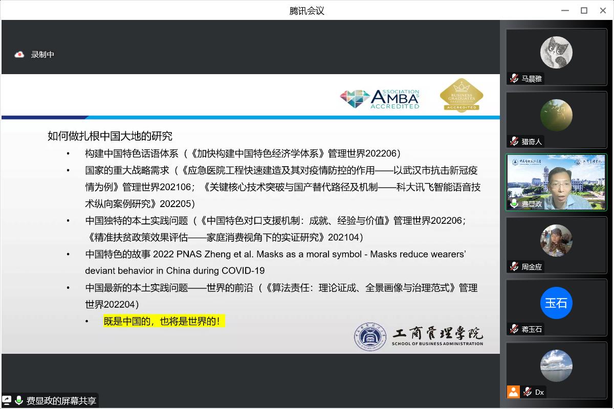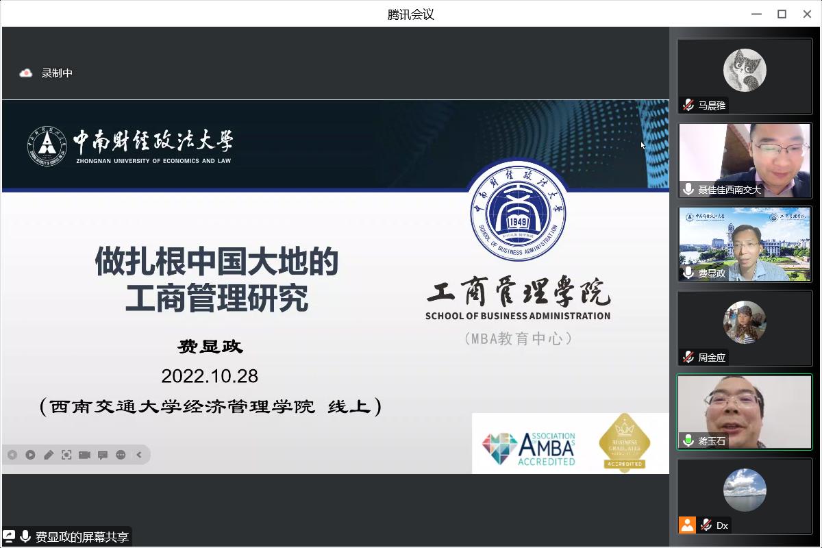 2022年10月28日19:00,中南财经政法大学工商管理学院副经理费显政教授应邀为公司师生带来题为“做扎根中国大地的工商管理研究”的线上讲座。本次学术活动由市场学系蒋玉石教授主持,校内外师生80余人参加了本次讲座。